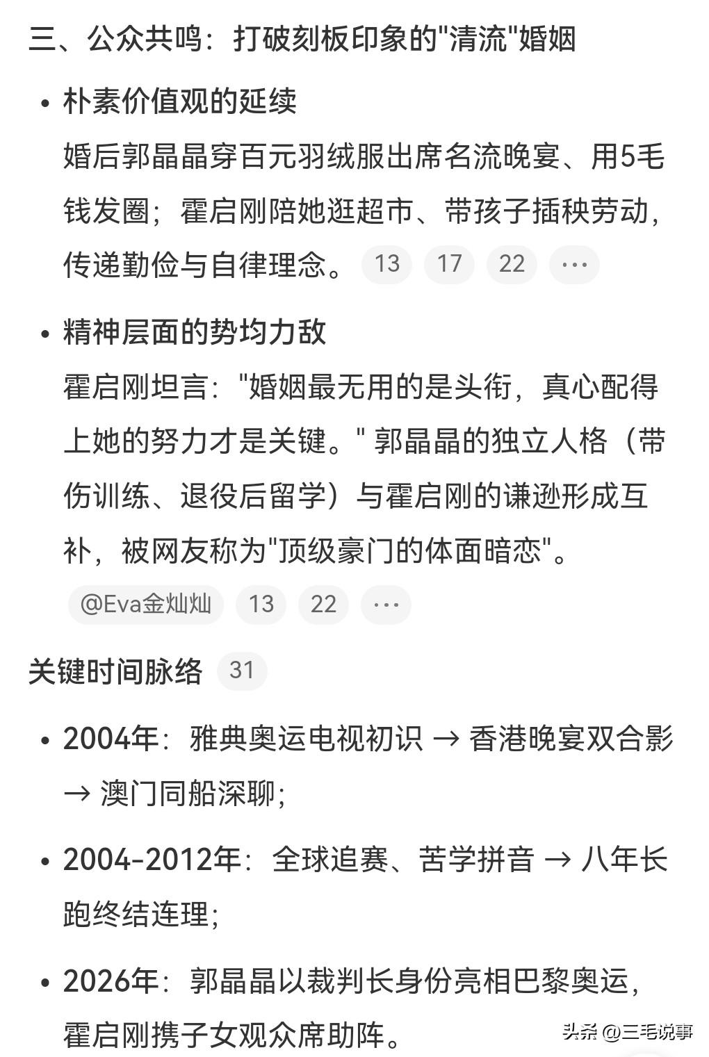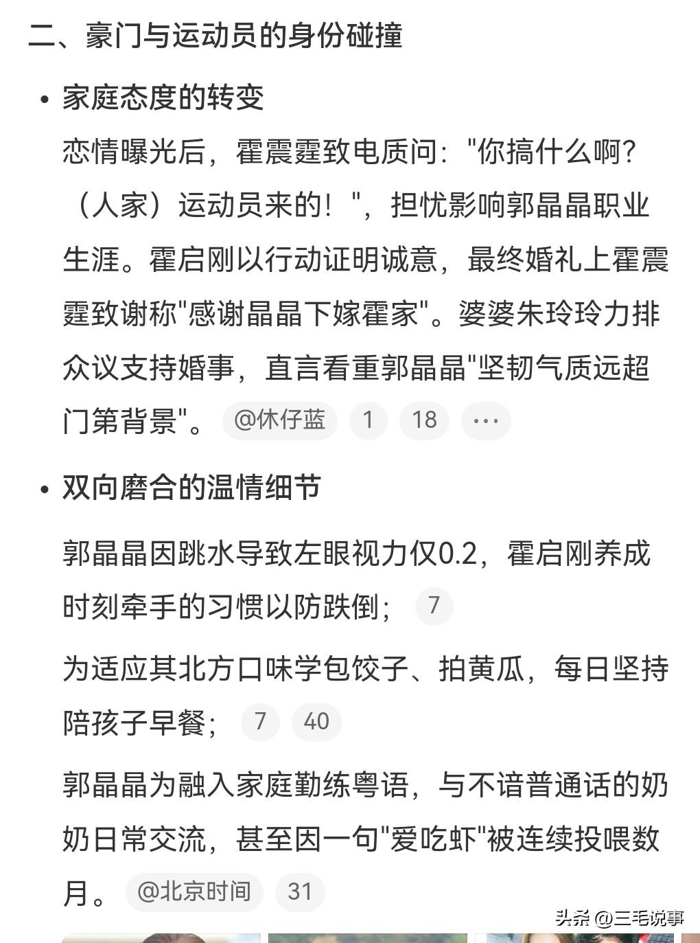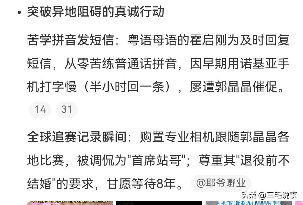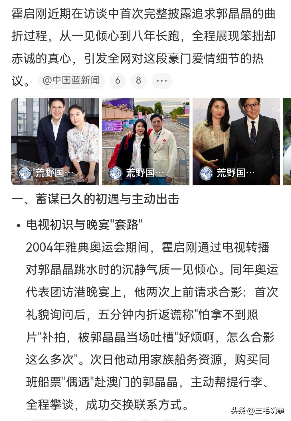想不到霍启刚追求郭晶晶也是费尽心思,像这么有钱的大佬,也是非常有诚意的。近日霍启刚在访谈节目中透露追求郭晶晶的过程,利用机会多次合影,还利用便利和其同船。他那点小心思,难道郭晶晶会不明白吗?后来两个人被媒体拍到,霍震霆打电话给霍启刚,对他说你搞什么呀,郭晶晶是运动员来的。他这是怕影响郭晶晶的运动生涯。 后来利用资源“偶遇”郭晶晶,还帮她提行李,一起攀谈,这下要到了联系方式。 而且尊重其退役前不结婚的决定,一等就是8年,霍启刚真的是有心了。 霍启刚和郭晶晶的爱情真的是太让人羡慕了。一个幸福美满的家庭,那种爱是刻到骨子里面的,霍启刚真的是不可多得的好男人。郭晶晶也是一个贤妻,不乱花钱,还用五毛钱的发圈。这真的是太可贵了。