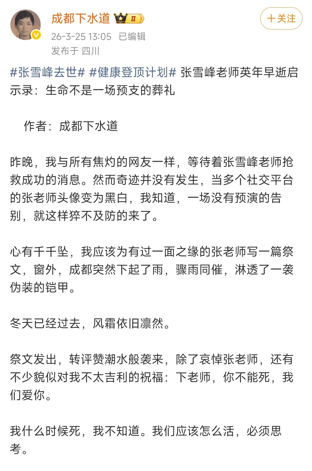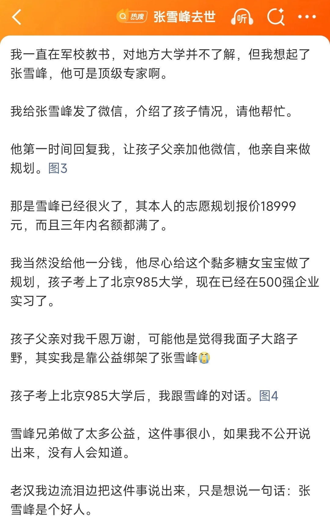 当年他找张雪峰帮一个黏多糖宝宝做志愿规划,那时候张雪峰本人报价18999,三年名额都排满了,结果一分钱没要,亲自给孩子做规划,最后孩子考上北京985,现在都在500强实习了!他生前被骂“贩卖焦虑”“功利”,可谁知道他偷偷给母校捐助学金,熬夜免费连麦帮寒门孩子改志愿?他是从农村爬出来的苦孩子,最懂没资源的孩子有多难,拼了命想给后来人铺条路。