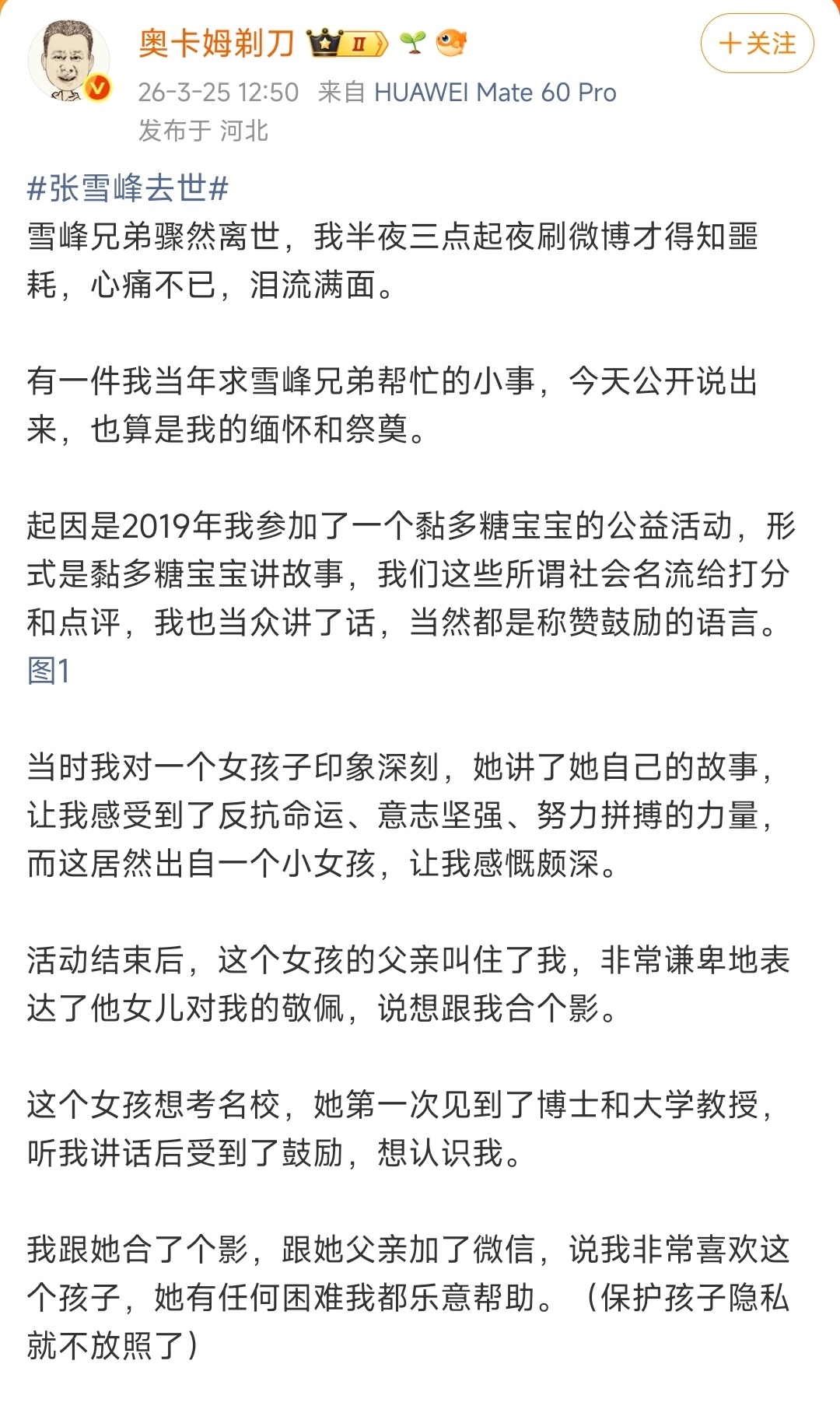 奥卡姆剃刀发布长文悼念张雪峰。当年他找张雪峰帮一个黏多糖宝宝做志愿规划,那时候张