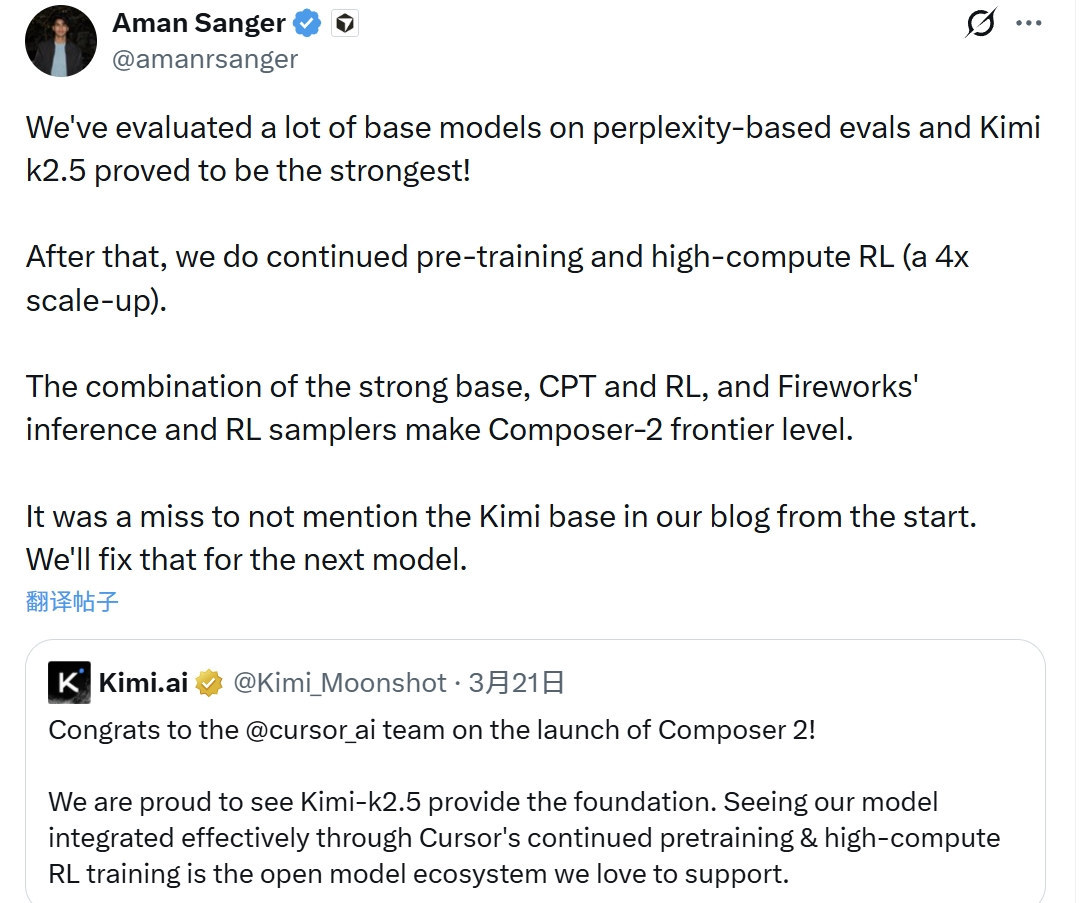 就在上周,全球主流AI原生代码编辑器Cursor的联合创始人阿曼·桑格(Aman Sanger)在社交平台X公开承认,其团队推出的新代码模型Composer 2,正是基于中国企业月之暗面的开源模型Kimi K2.5开发。月之暗面本周也证实,双方开展了授权商业合作。