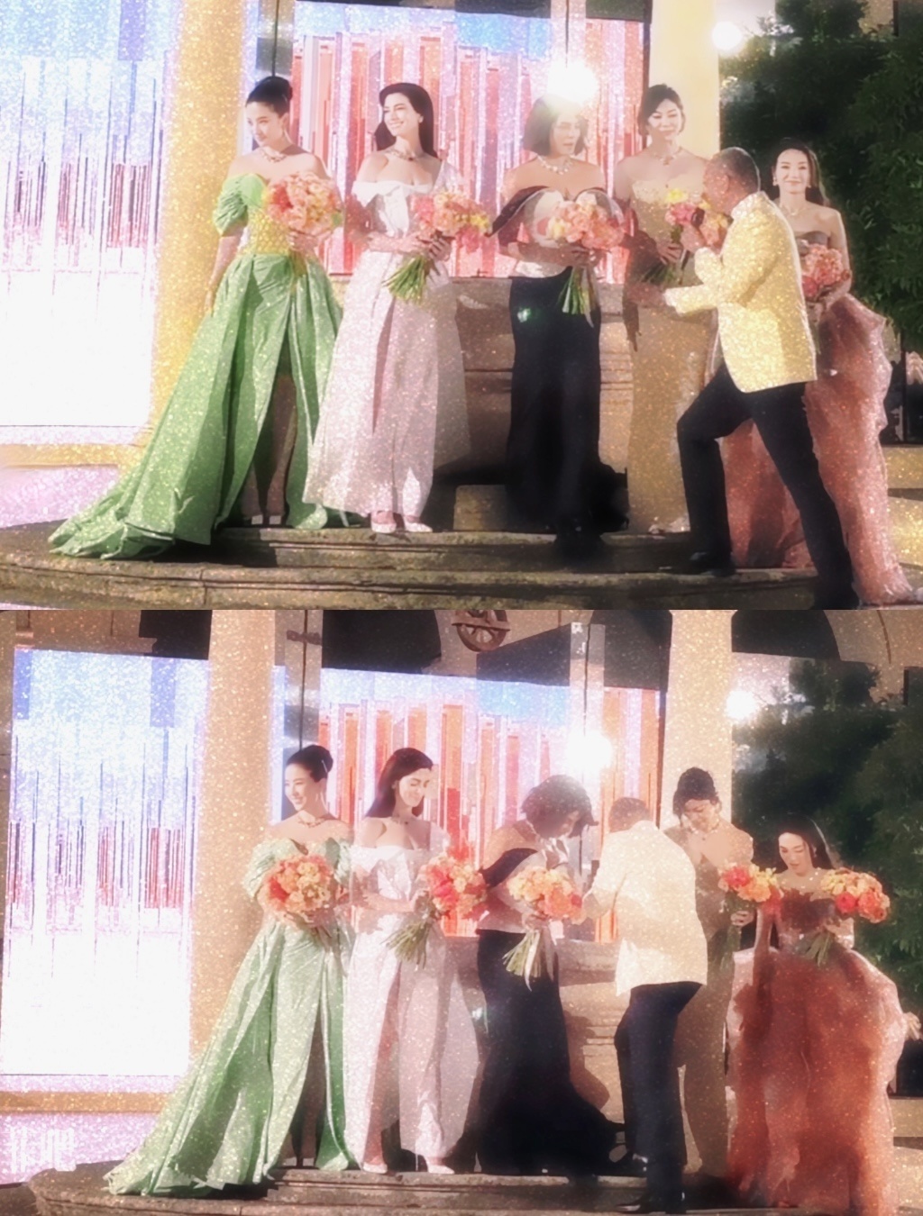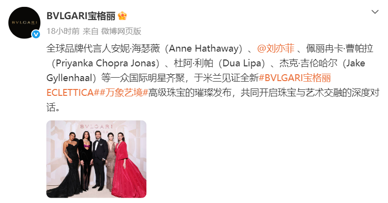 宝格丽合照站位身着大裙摆的经常站两边来对称,感觉跟商量过的似的,而全球代言人们出席礼服色彩搭配上亮眼优雅且相得益彰,所以每次都能有不错的画面效果呈现吧,代言人们都很美很熟悉啦氛围每次也都很美好~