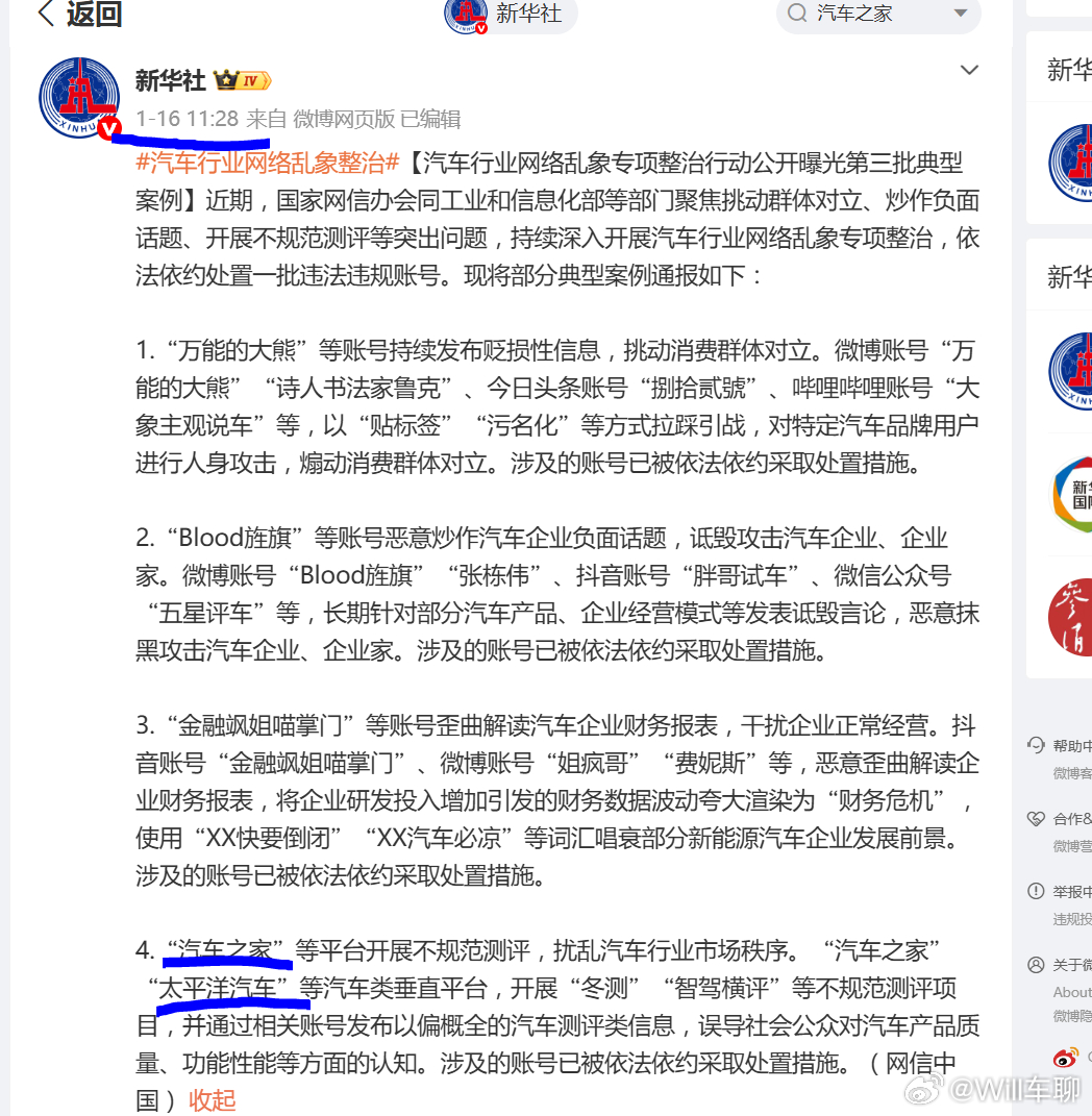 其实这是个旧闻了,之前新华社1月16日专门出了通知(图3),说汽车之家的冬测,智驾横评不规范测评,以偏概全。从那个时候,就应该不能被关注了。今天实际是已经恢复正常了。