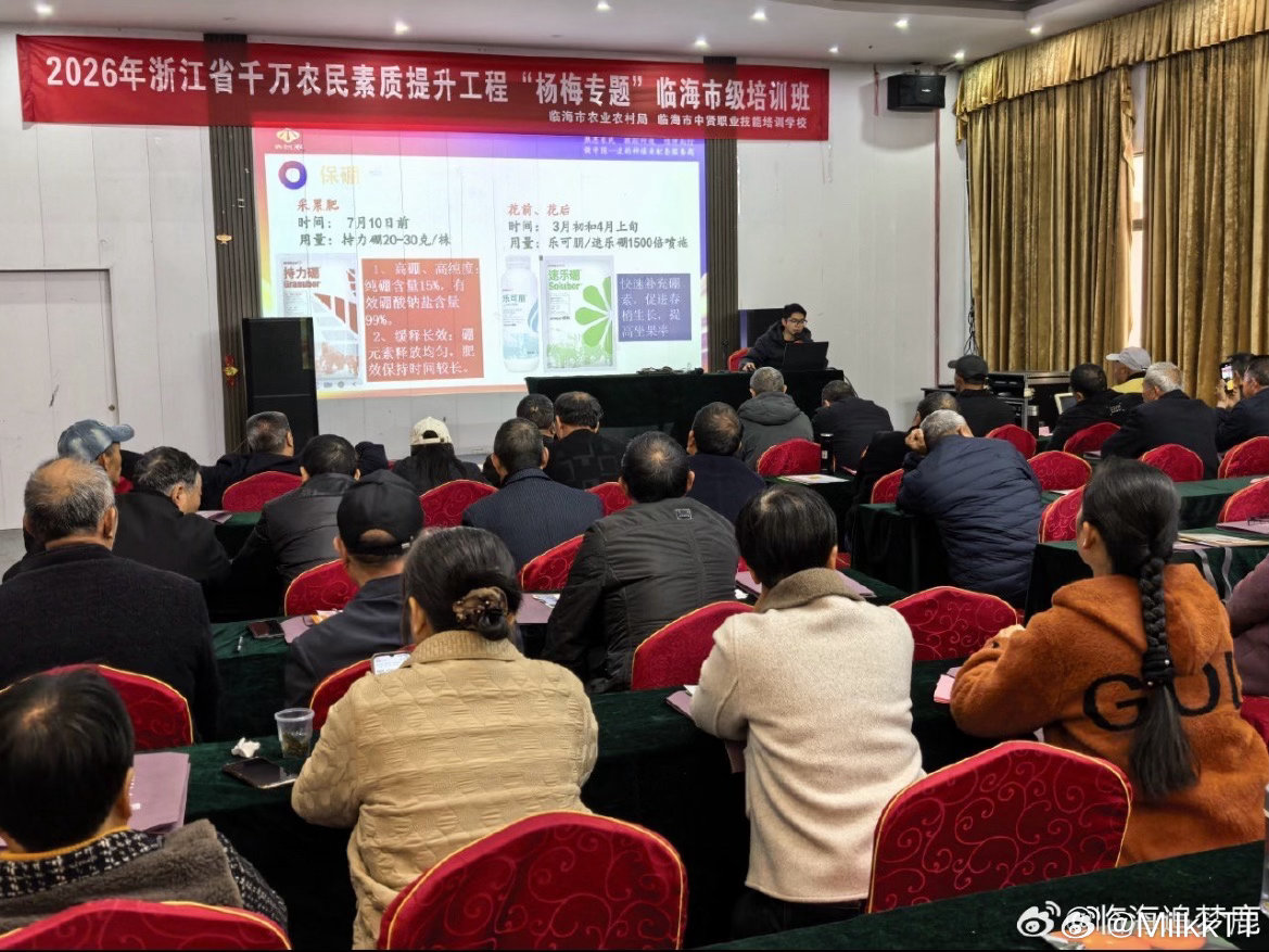 台州农技赋能杨梅产业助力乡村共富2026年浙江千万农民素质提升工程“杨梅专题”培训班在临海开班,4天培训聚焦春季管理、绿色防控、农产品营销等实用内容,理论实践结合,农户收获满满。