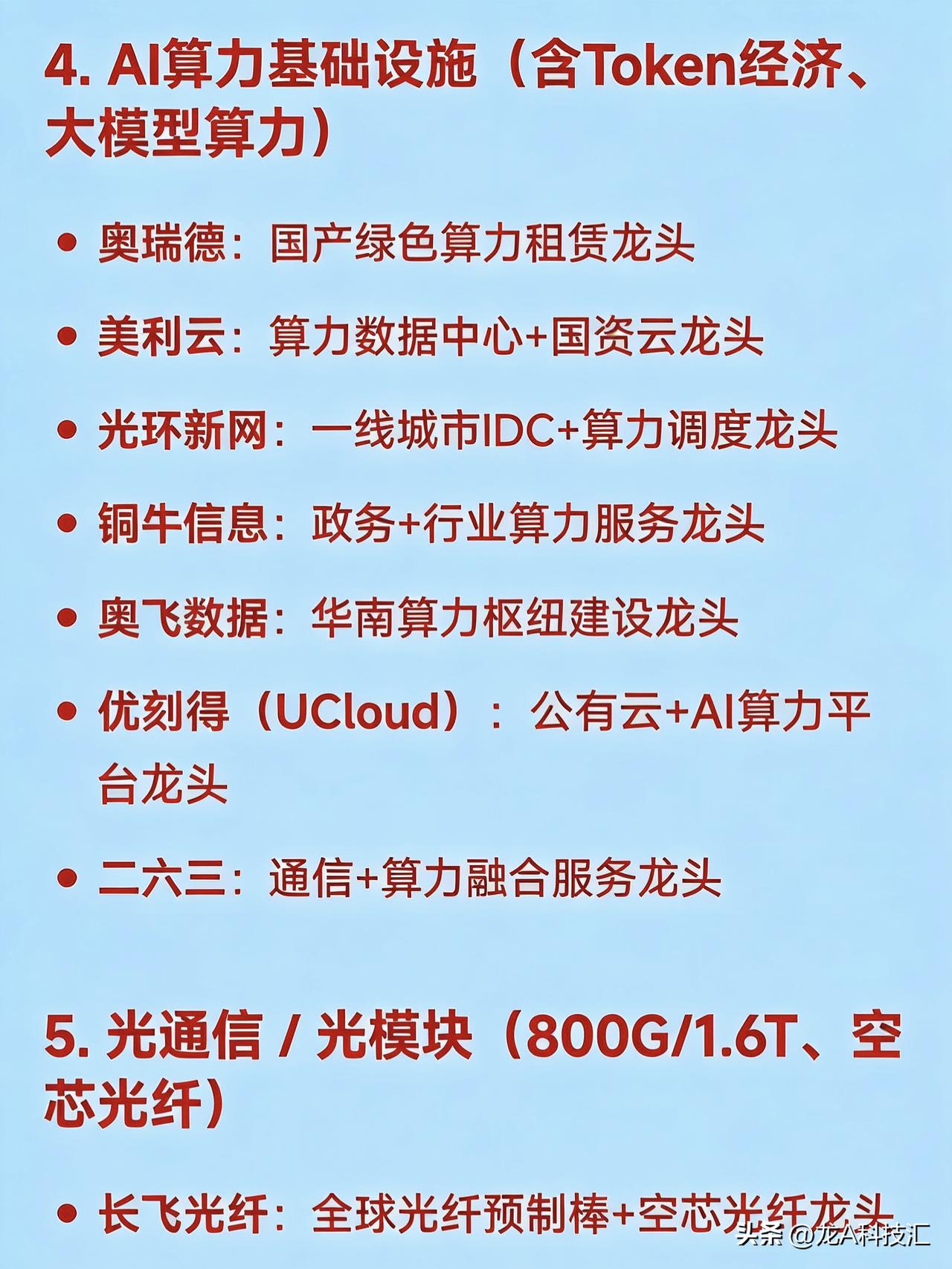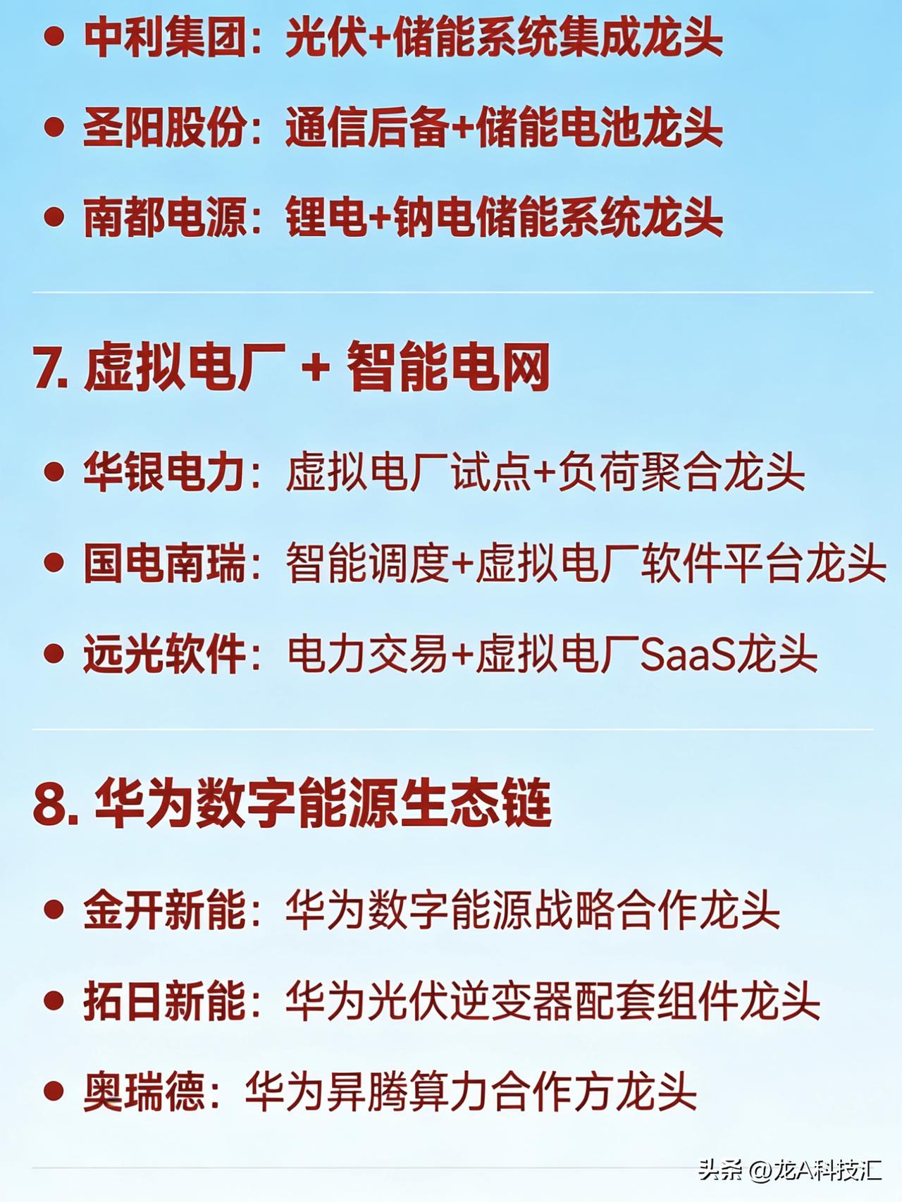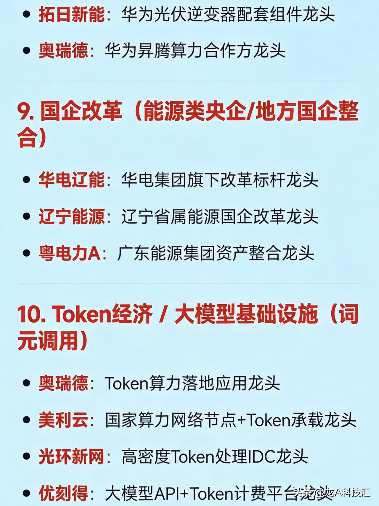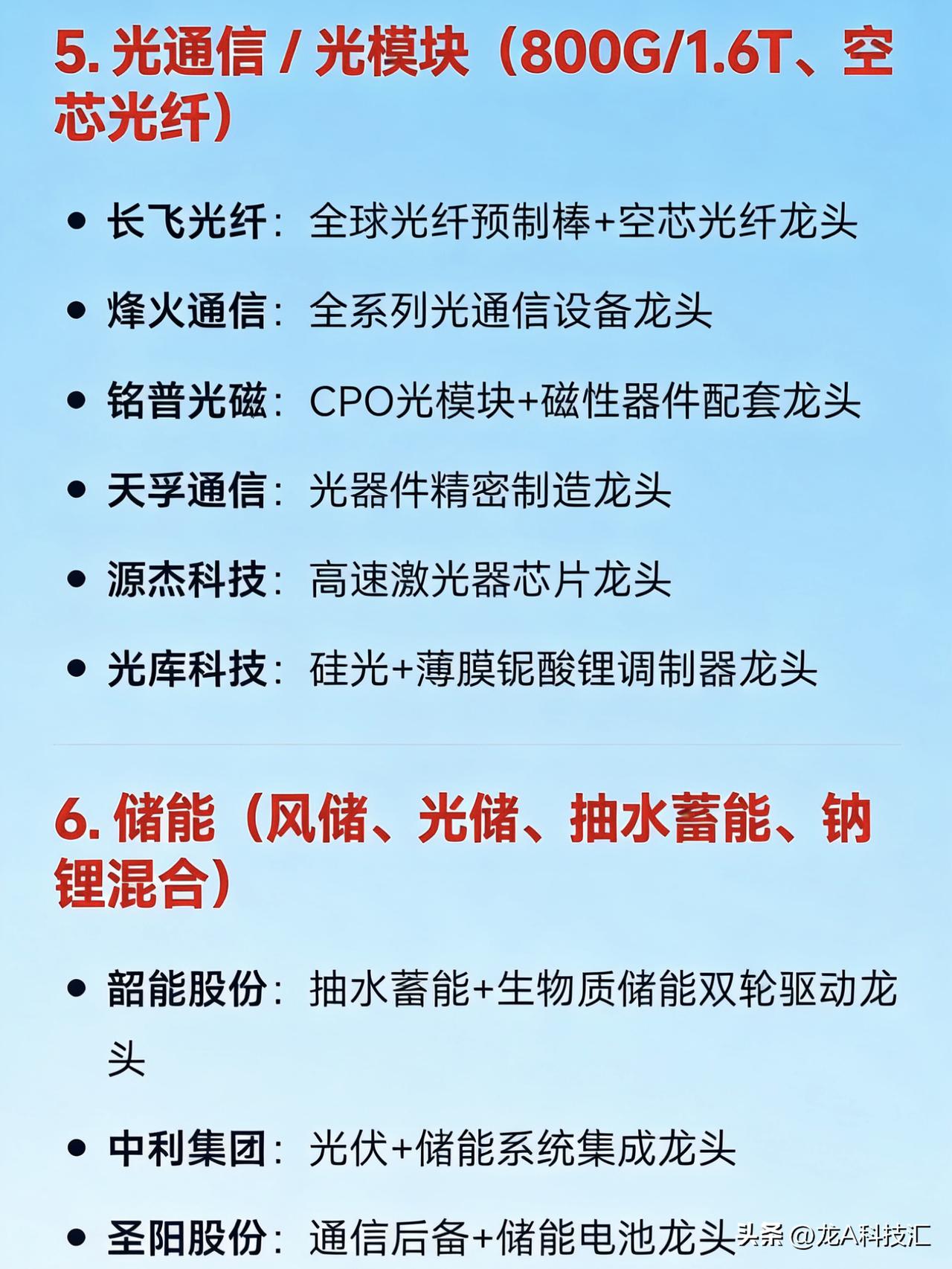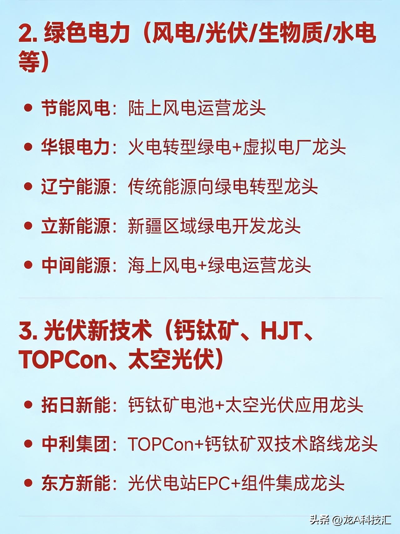 2026年3月25日十大热点科技及其产业链核心龙头 1. 算电协同(绿电 + 算力融合) 华电辽能:算电协同+碳交易综合龙头 金开新能:绿电直供算力中心龙头 韶能股份:算电协同+数据中心绿电供应龙头 粤电力A:“光储算网”一体化项目龙头 奥瑞德:绿色算力中心运营龙头 2. 绿色电力(风电/光伏/生物质/水电等) 节能风电:陆上风电运营龙头 华银电力:火电转型绿电+虚拟电厂龙头 辽宁能源:传统能源向绿电转型龙头 立新能源:新疆区域绿电开发龙头 中闽能源:海上风电+绿电运营龙头 3. 光伏新技术(钙钛矿、HJT、TOPCon、太空光伏) 拓日新能:钙钛矿电池+太空光伏应用龙头 中利集团:TOPCon+钙钛矿双技术路线龙头 东方新能:光伏电站EPC+组件集成龙头 4. AI算力基础设施(含Token经济、大模型算力) 奥瑞德:国产绿色算力租赁龙头 美利云:算力数据中心+国资云龙头 光环新网:一线城市IDC+算力调度龙头 铜牛信息:政务+行业算力服务龙头 奥飞数据:华南算力枢纽建设龙头 优刻得(UCloud):公有云+AI算力平台龙头 二六三:通信+算力融合服务龙头 5. 光通信 / 光模块(800G/1.6T、空芯光纤) 长飞光纤:全球光纤预制棒+空芯光纤龙头 烽火通信:全系列光通信设备龙头 铭普光磁:CPO光模块+磁性器件配套龙头 天孚通信:光器件精密制造龙头 源杰科技:高速激光器芯片龙头 光库科技:硅光+薄膜铌酸锂调制器龙头 6. 储能(风储、光储、抽水蓄能、钠锂混合) 韶能股份:抽水蓄能+生物质储能双轮驱动龙头 中利集团:光伏+储能系统集成龙头 圣阳股份:通信后备+储能电池龙头 南都电源:锂电+钠电储能系统龙头 7. 虚拟电厂 + 智能电网 华银电力:虚拟电厂试点+负荷聚合龙头 国电南瑞:智能调度+虚拟电厂软件平台龙头 远光软件:电力交易+虚拟电厂SaaS龙头 8. 华为数字能源生态链 金开新能:华为数字能源战略合作龙头 拓日新能:华为光伏逆变器配套组件龙头 奥瑞德:华为昇腾算力合作方龙头 9. 国企改革(能源类央企/地方国企整合) 华电辽能:华电集团旗下改革标杆龙头 辽宁能源:辽宁省属能源国企改革龙头 粤电力A:广东能源集团资产整合龙头 10. Token经济 / 大模型基础设施(词元调用) 奥瑞德:Token算力落地应用龙头 美利云:国家算力网络节点+Token承载龙头 光环新网:高密度Token处理IDC龙头 优刻得:大模型API+Token计费平台龙头 免责声明:发文涉及资讯图等内容来自网络公共信息。仅供参考,不构成投资建议。