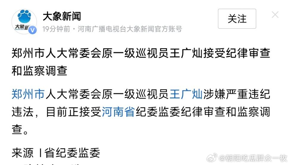 郑州市人大常委会原一级巡视员王广灿接受纪律审查和监察调查。