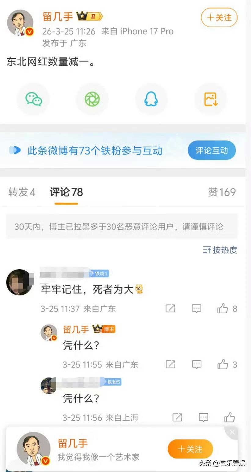 3月25日,留几手冲上了热搜,原因是张雪峰去世后,留几手在个人社交账号上,发文说:“东北网红数量减一。”