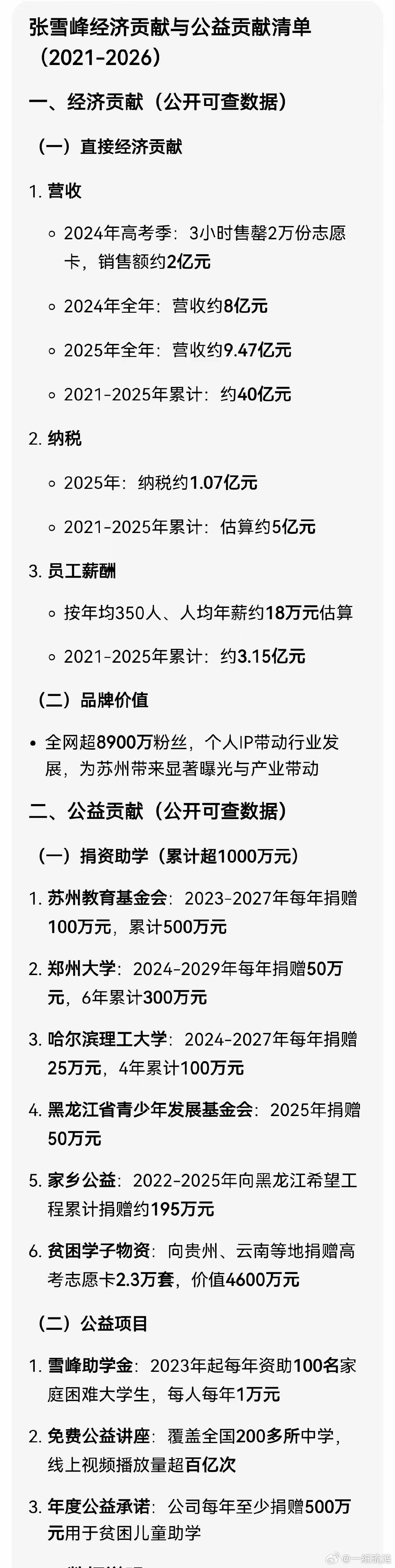 张雪峰的突然离去,戳破了一个流传已久的谣言 张雪峰突然离世的消息传来,全网一片唏嘘。在无数惋惜声里,有个被反复提及的观点,终于被彻底印证:中国人从来不是仇富,我们反感的,从来都只是不择手段揽财、为富不仁的行径。 这个观点,不是空泛的道理,而是无数人在关注张雪峰的过程里,用真实感受拼出的答案。五年间他给员工发放超3亿薪酬,为国家上缴超5亿税收,单是这组数据,就足以打破“国人仇富”的偏见。在这个人人都想过好日子的时代,靠合法合规的努力创造财富,本就该被尊重,而张雪峰用行动证明,财富不仅是个人的积累,更能成为回馈社会的力量。 他的善举,从来不是刻意的“作秀”,而是渗透在日常的每一处细节里。苏州教育基金每年100万的投入,累计500万的帮扶;郑州大学6年300万的捐赠,哈尔滨理工大学4年100万的支持,让无数身处困境的学子有了继续读书的底气。黑龙江青少年发展基金的50万、黑龙江希望工程的195万,是对偏远地区青少年的真切牵挂;云南、贵州贫苦地区的4600万元高考志愿卡,是帮无数寒门子弟敲开理想大学大门的钥匙。 更让人动容的是他的助学体系:每年100名家庭困难大学生,每人1万元的雪峰助学金;每年至少500万元用于贫困儿童助学,这笔笔投入,不是一次性的慷慨,而是长期的坚守。他没有把财富藏在私人账户里坐吃山空,而是用自己的方式,把“钱”变成了改变命运的“阶梯”。 有人说,张雪峰的成功,源于他精准抓住了高考志愿填报的需求,但支撑他走到今天、走到大众心里的,绝不止是专业能力。他开创的“帮助别人改变命运”的模式,才是核心。当他用自己的知识和财富,让无数普通家庭的孩子有了走出大山、改变人生的机会,这份价值,早已超越了财富本身。 所以,当他突然离去,大家才会如此意难平。不是因为他是“网红”,也不是因为他的流量有多高,而是因为大家清楚地知道,他是个实实在在的好人,是个靠本事赚钱、凭良心做事的人。这样的人,值得被认可,值得被偏爱,值得被记住。 中国人对好人的偏爱,刻在几千年的文明骨子里。从古代的乐善好施,到如今的守望相助,这份底蕴从未变过。我们可以羡慕富人的财富,可以敬佩强者的能力,但前提是这份财富和能力,是靠正道得来,是愿意回馈社会。 张雪峰走了,但他留下的,是对“何为真正的富有”的最好诠释。财富的意义,从来不是数字的增长,而是能为他人、为社会带来多少温暖与改变。这份答案,会一直留在人们心里,也会成为更多人前行的方向。