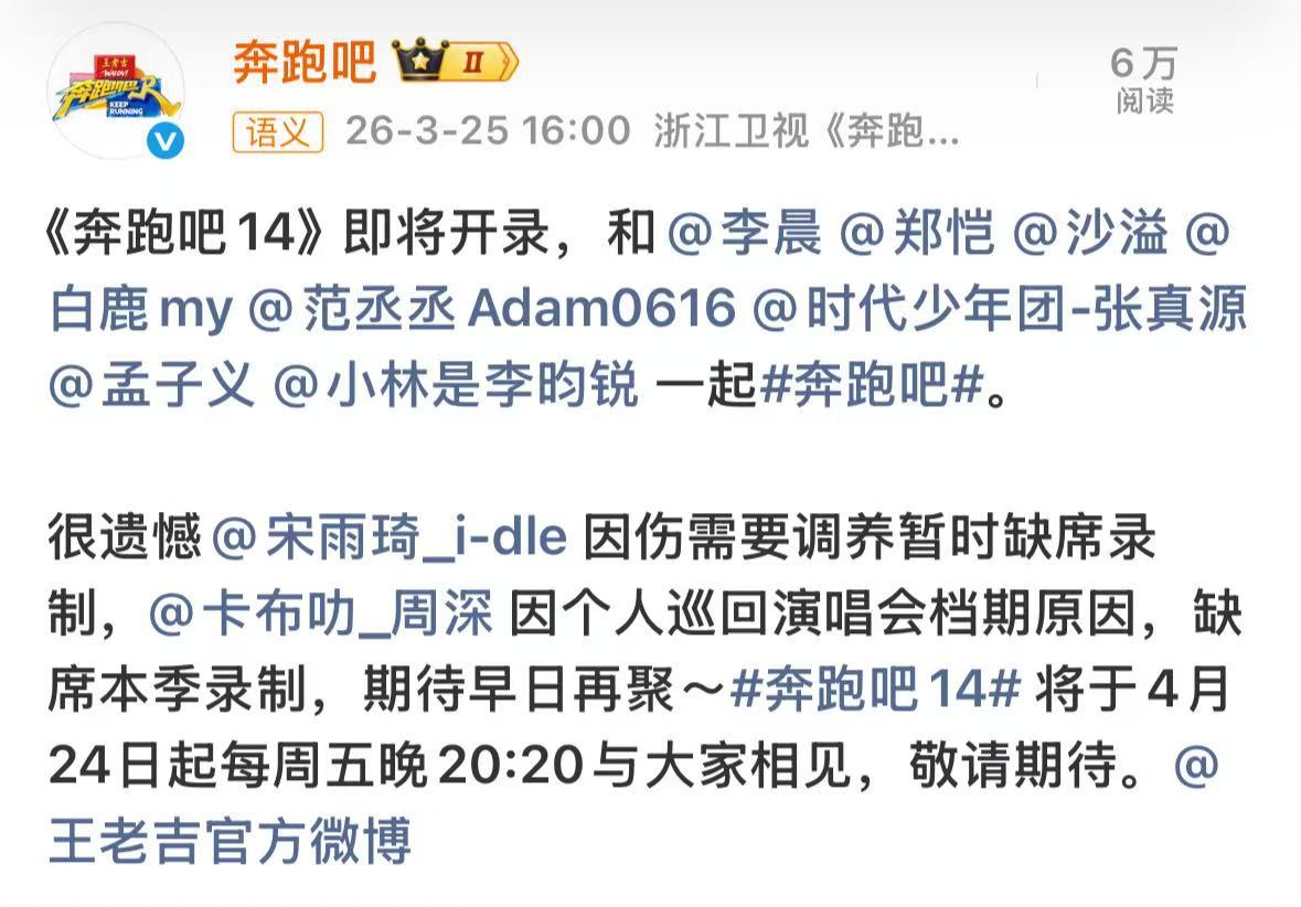 宋雨琦因伤缺席跑男录制宋雨琦缺席宋雨琦因伤缺席跑男录制!快快好起来~