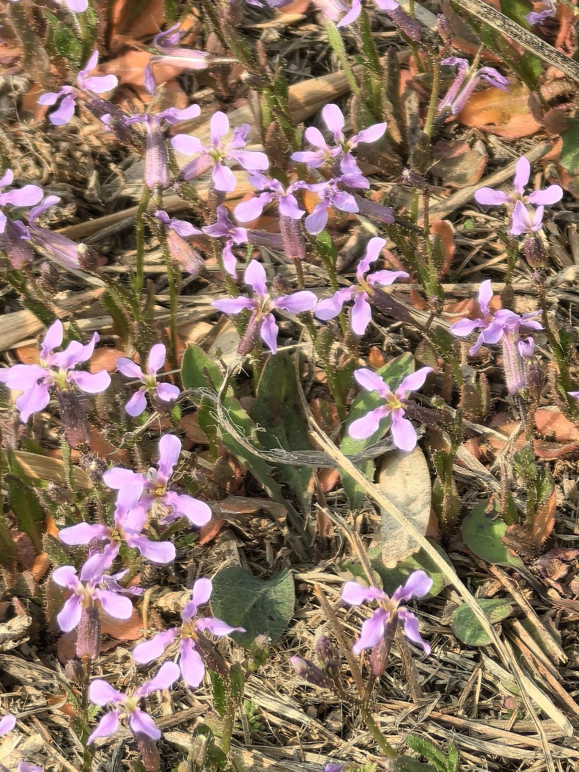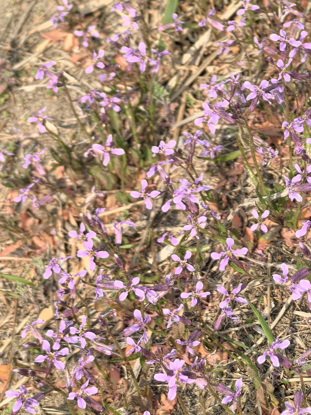 在圆明园遗址公园藻园小河边的草地上,我发现了一小片紫色的小花,花朵不大,四片花瓣,密密麻麻的开了一片,远远望去就像给褐色的土地上铺上了一层紫色花毯。在网上搜索一查,原来它叫“离子芥”,属于十字花科,也叫芥儿菜。