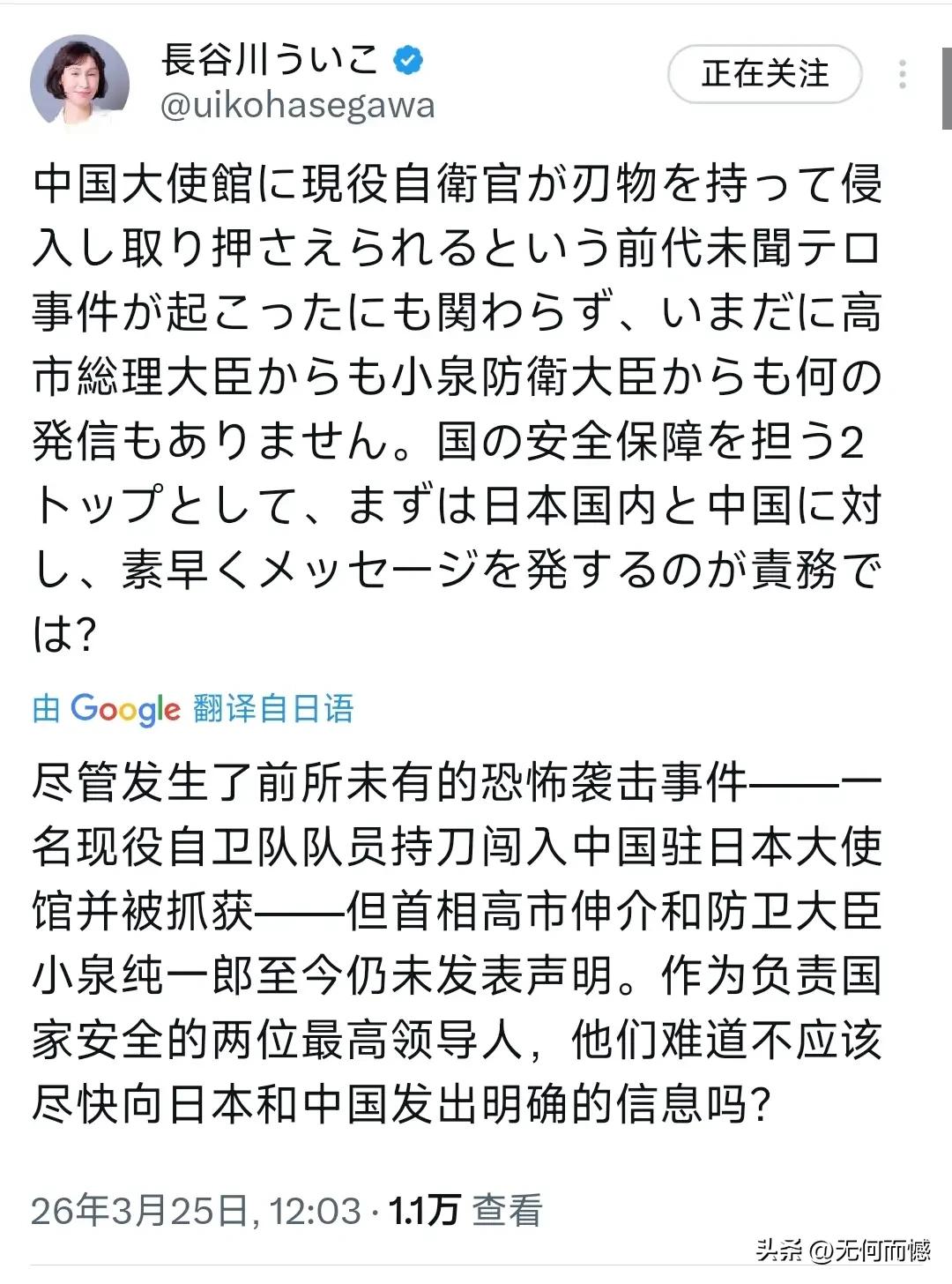 一名23岁的日本陆上自卫官,揣着18公分的刀翻墙闯入中国驻日使馆,并扬言要杀人,这场荒诞闹剧撕开了日本社会的层层脓疮。从行为看,本质就是想用暴力裹挟外交,把野蛮当“风骨”,完全是现代文明的倒退。更讽刺的是,出现这样的事情之后,日本首相和防卫大臣至今装聋作哑,连句像样的声明都没有,这种“集体失语”恰恰暴露了其纵容极端思潮的懦弱本质。 从根源看,这绝非孤立个案。日本政府近年不断强化扩军备战,把“台湾有事”绑定自卫队出兵,反复炒作“中国威胁”,这种反华政治操弄早已渗透到自卫队内部,把年轻人洗脑成极端仇华的工具人。当整个国家都在煽动对立,出现持刀闯使馆的疯子,不过是必然结果。这场闹剧里,沉默的政客是幕后推手,而整个日本,正被这种危险的民粹主义拖向深渊。