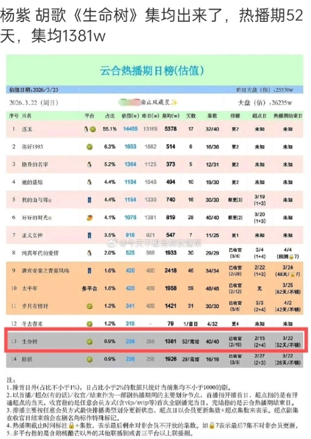 杨紫《生命树》集均1381万!《生命树》热播期52天结束,最终云合集均1381万,不过还好,正午阳光播放量最差的一部还是张新成的《淬火年代》,一部剧云合低并不影响演员的资源,杨紫这两年最大问题不是云合,而是她的剧只要上星收视率就很低,现在被打上了砸穿收视底盘的标签,其他方面有劣势好补救,收视率不行很难补救,这次甚至连这么大制作大营销的央视剧的收视也是倒数,她这个标签短时间内很难改观了,谭松韵则相反,每次网播量一般,但收视率都很不错。