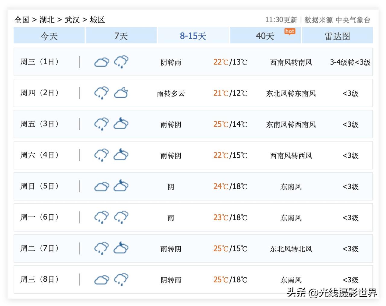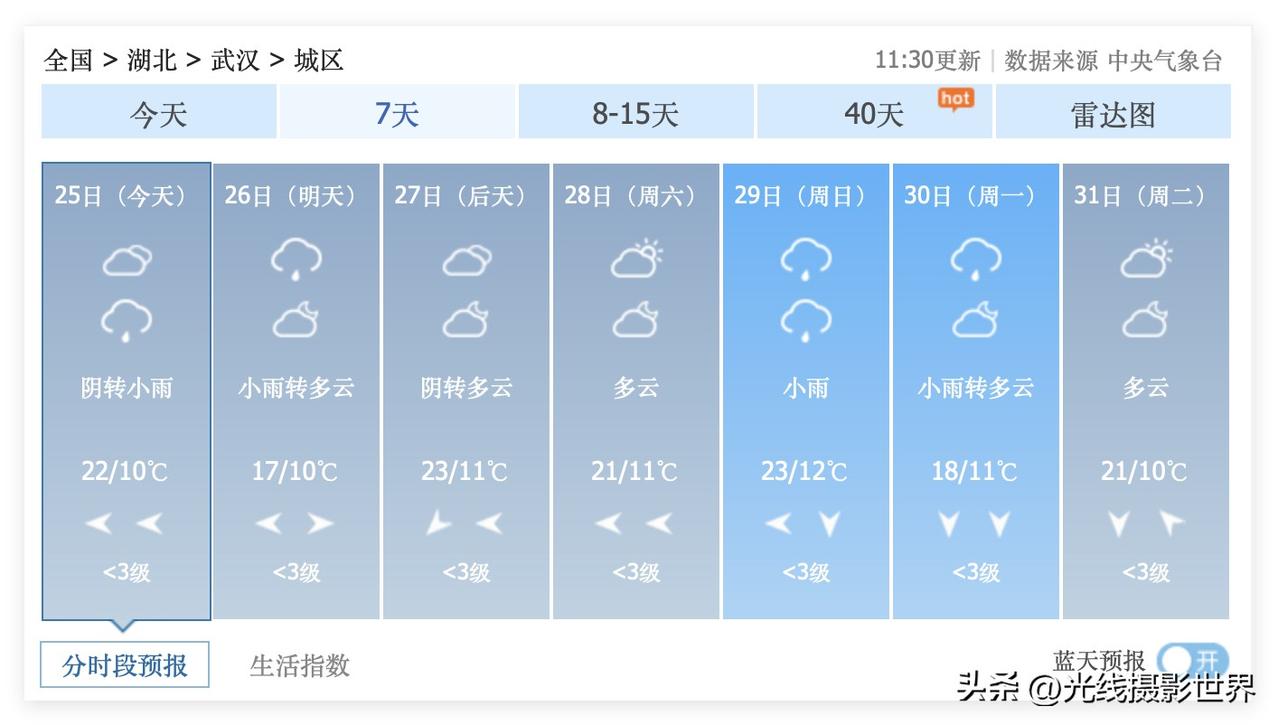 噢!湖北省武汉市,这周末,星期六出太阳,星期天要下雨!3月28日,星期六,武汉多云,非常适合去武汉大学欣赏樱花,大家一定要珍惜这个星期六的好天气,错过可能再等一年! 3月29日,星期天,武汉小雨……噢……周末偏偏要下雨,真是不巧啊! 好吧,这个星期六,大家一定要抓住2026年春天最后的高潮尾巴……下个周末就是4月啦! 4月……当然也是非常美好,但是,赏花就不能和3月相提并论了哟! 总体来说,未来10天半个月,武汉天气,阴晴不定,阴雨天比较多,太阳比较少,优质的蓝天比较少见……中央气象台最新天气预报……清明时节雨纷纷……不是吹的……