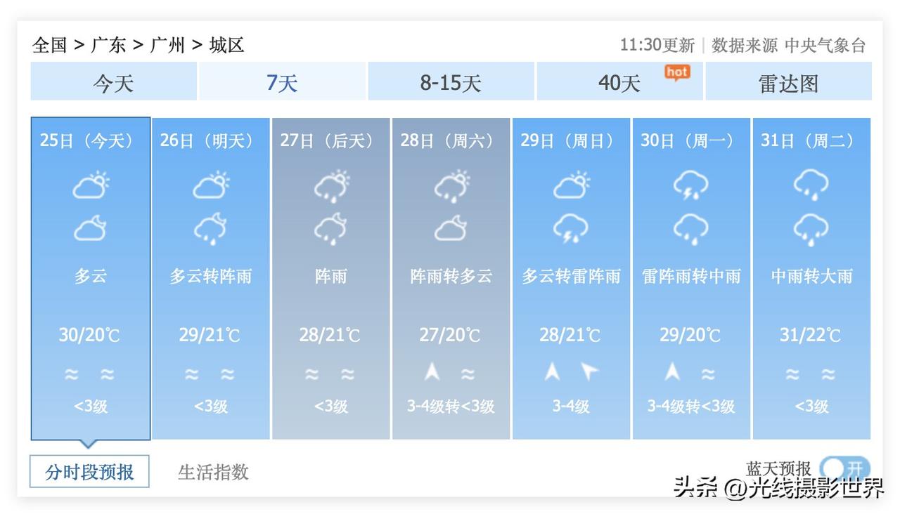 哎呀!真没想到,3月25日,星期三下午,广东省广州市,最高气温已经冲破30度啦!而且,湿度51%,估计是有点闷热了,不少广州人今天恐怕不由自主拿起空调遥控器开启制冷功能了吧?!西晒房,通风不好的公寓……没有办法的办法…… 中央气象台最新天气预报显示……3月31日,广州中雨转大雨,最高气温31度,这究竟是啥鬼天气啊?!31度高温的大雨天……该有多么的难受啊?!闷热,潮湿……空气中全都是汗臭味……究竟是开空调的制冷功能还是除湿功能呢?!到时候真的考研大家的空调使用智商啊! 好吧,接下来的4月,广州市,恐怕常常会比较烦闷,潮湿,闷热……4月,广州人的电费,可能会明显贵过3月……正常正常,每年都差不多这样……不必大惊小怪…… 3月26日到4月6日,广州市经常下雨,气温偏高……可能会很容易发霉发臭……家里衣柜可能会有蘑菇大丰收……大家要有心理准备…… 接下来一段时间,广州市,不是那么舒适,不是那么适合旅游和宜居……