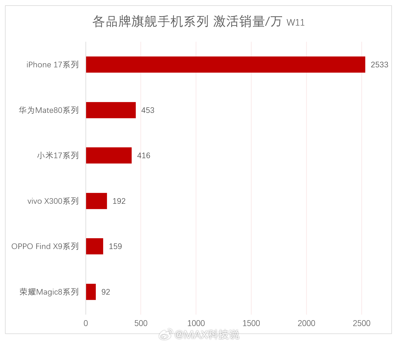 各品牌旗舰手机激活销量,截止W11:苹果iPhone 17系列:2533万华为M