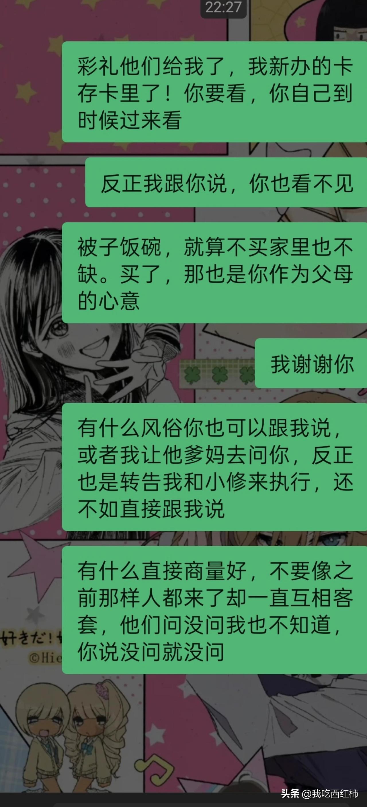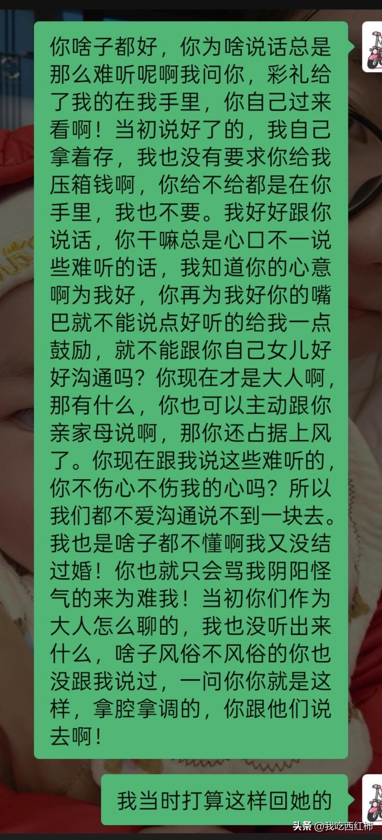 说好的彩礼自己存不要陪嫁,父母又反悔了 我不懂,我也不理解,永远只能在别人面前装作被父母宠爱的人,因为说出来总会有一句“应该没有父母不爱自己的小孩吧,怎么会有这样的父母”,再次扎心! 不是男方父母没作为,我也不偏袒,我只是自己作为一个女儿跟自己妈妈沟通。算了,一年到头也就说几次话,还都是装出来的,我是不孝顺的女儿要骂就骂呗,哈哈哈哈哈哈
