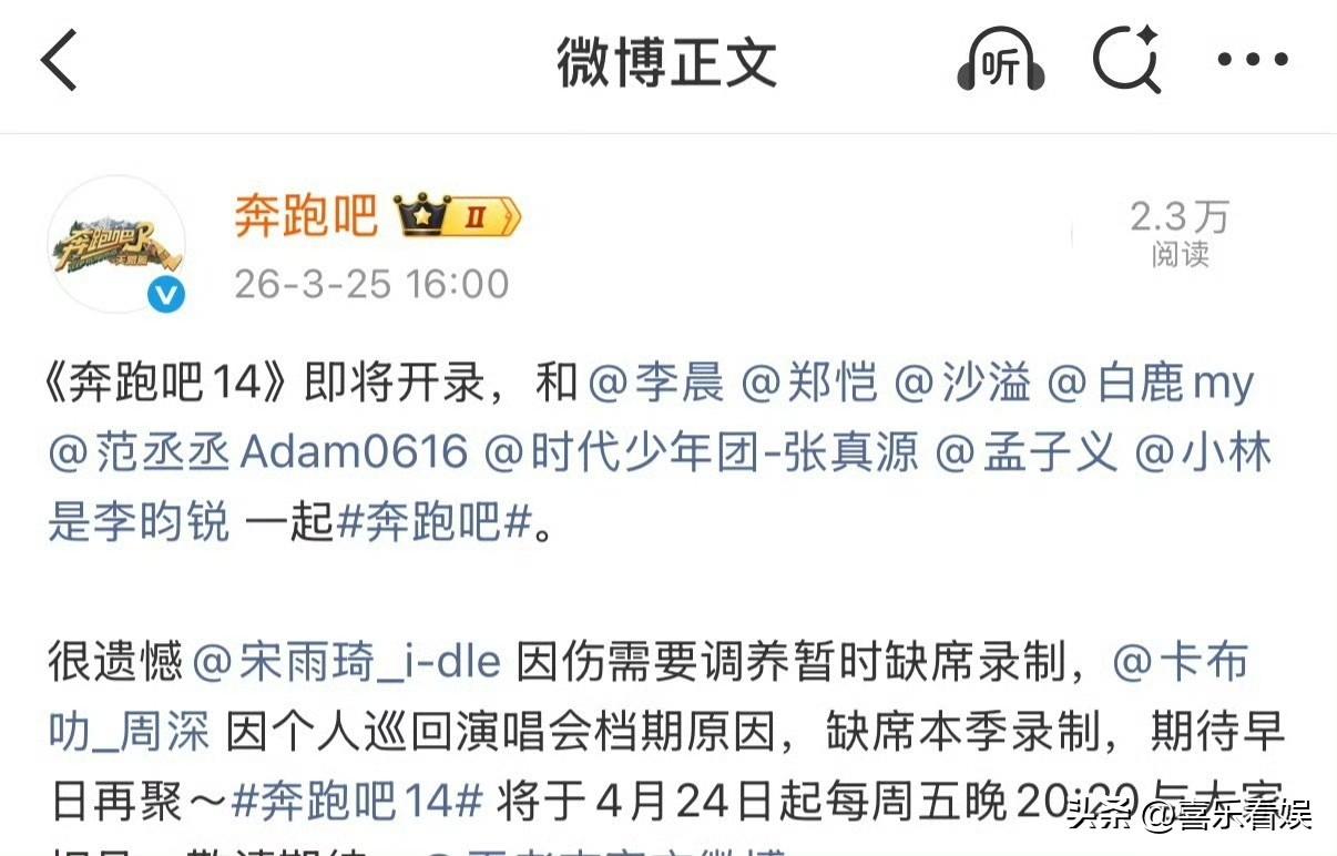 3月25日,《奔跑吧14》官宣即将开录,结果却传来两个让人遗憾的消息——宋雨琦和周深都要缺席本季录制了。
