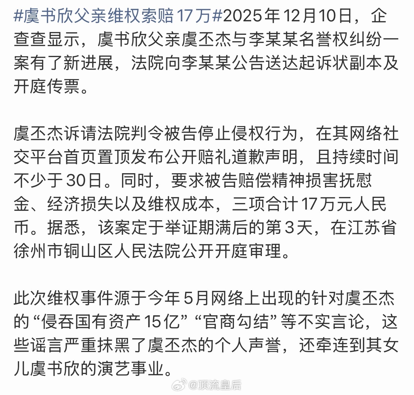 我看到网友扒出律师说的顶流明星家属起诉侵犯名誉权要求公开道歉索赔十几万的案件,疑似对应的是虞书欣父亲。判决结果是不用道歉不用赔偿。