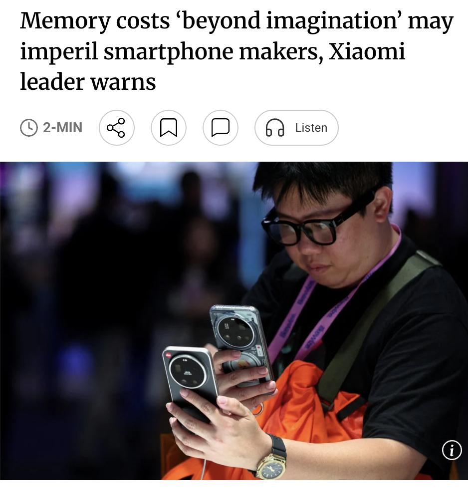 外媒:小米总裁卢伟冰在业绩电话会上警告,内存芯片价格正以"超乎想象"的幅度飙升,将智能手机厂商拖入长期涨价周期。他直言,"当涨价周期结束时,部分厂商可能面临巨额亏损甚至倒闭",但同时指出这一压力也将倒逼行业创新。 财务数据方面,小米第四季度净利润同比下滑27%至65亿元人民币(约9.43亿美元),为近一年来最低季度利润,也是2024年第二季度以来首次同比下降。营收同比增长7.3%至1169亿元,符合市场预期。 小米2025年第四季度智能手机出货量同比下滑11.6%至3770万部,手机业务收入随之下降13.6%至443亿元。尽管小米持续向高端市场转型,平均售价仍从去年同期的1202元小幅下滑至1176元,降幅约2.2%。 内存成本上涨正成为整个智能手机行业的共同挑战,行业格局或因此面临重塑。