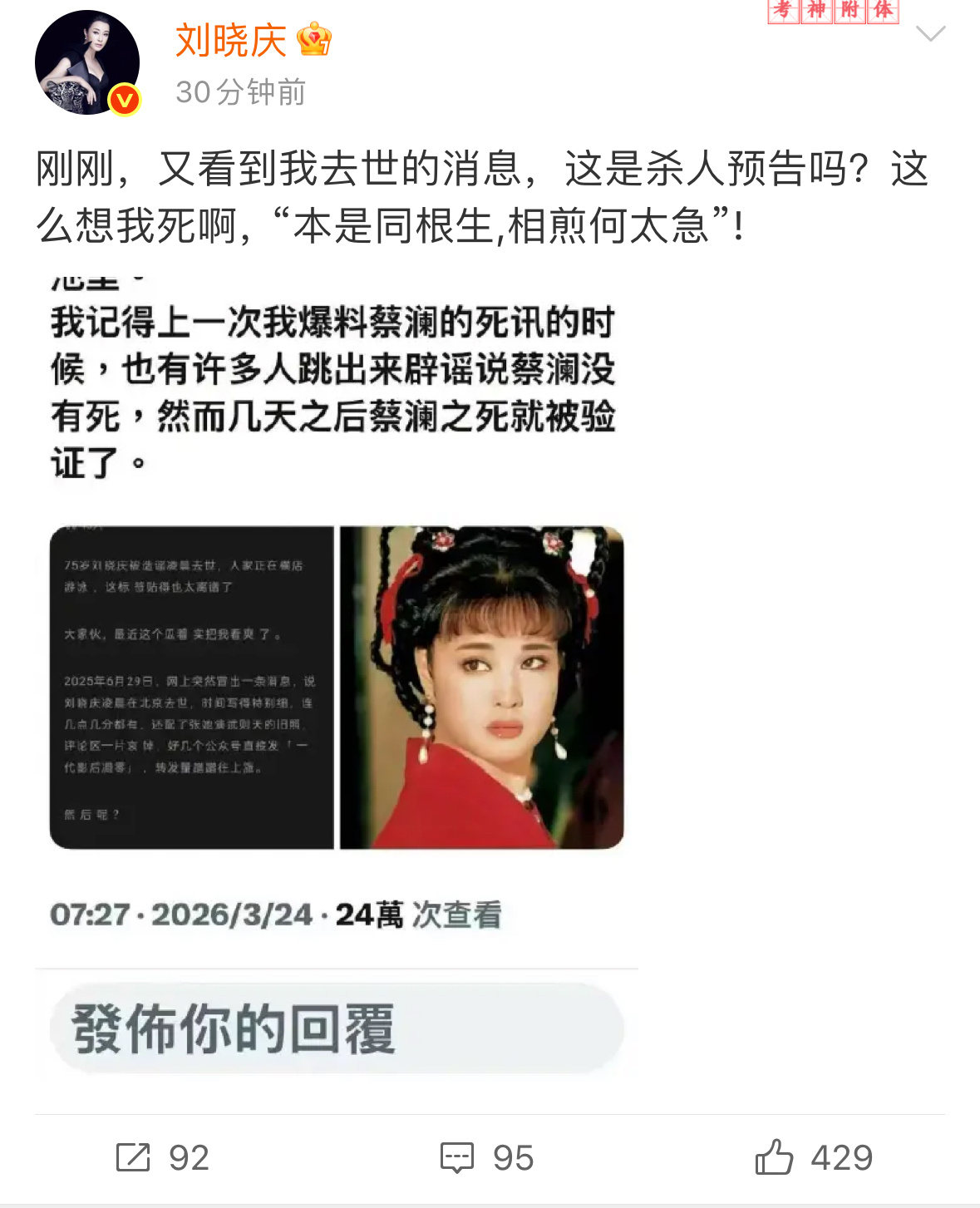 刘晓庆亲自辟谣去世谣言姐生命力旺盛的像喷泉一样 “就不si” 刘晓庆再发文辟谣去