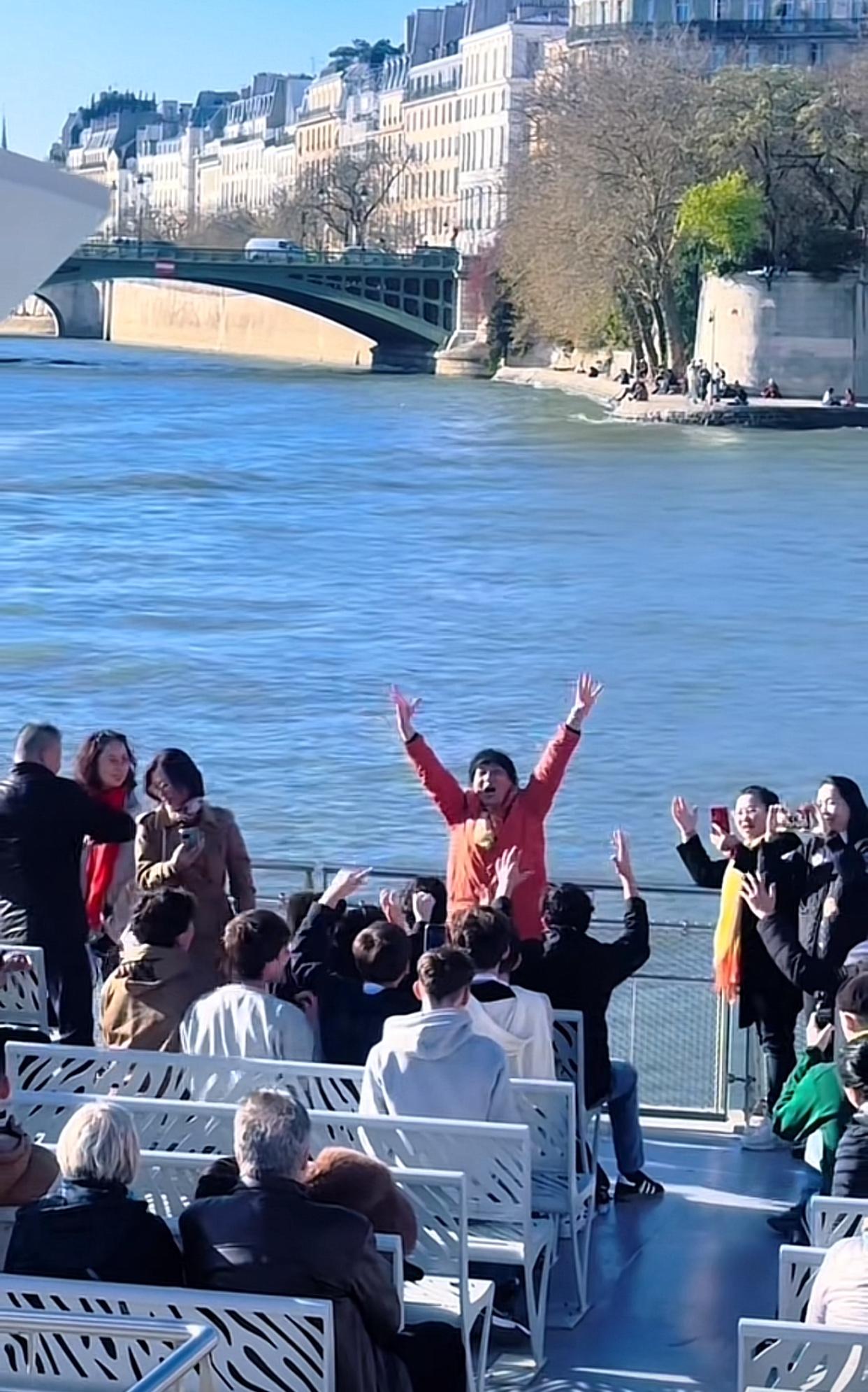 近日,网友分享,他在塞纳河游船上遇到了中国阿姨,这位阿姨在船上带领着一众外国小年轻们高喊“l love china ”! 阿姨喊一遍,他们跟着喊一遍,连续喊了三遍!之后举起双手一起“啊~”欢呼,最后阿姨优雅的转身离去… 你别说这两个群体,总能碰撞出激情的火花,都能够给彼此满满的情绪价值! 网友评论:teenager最严厉的母亲[笑哭][笑哭][笑哭]