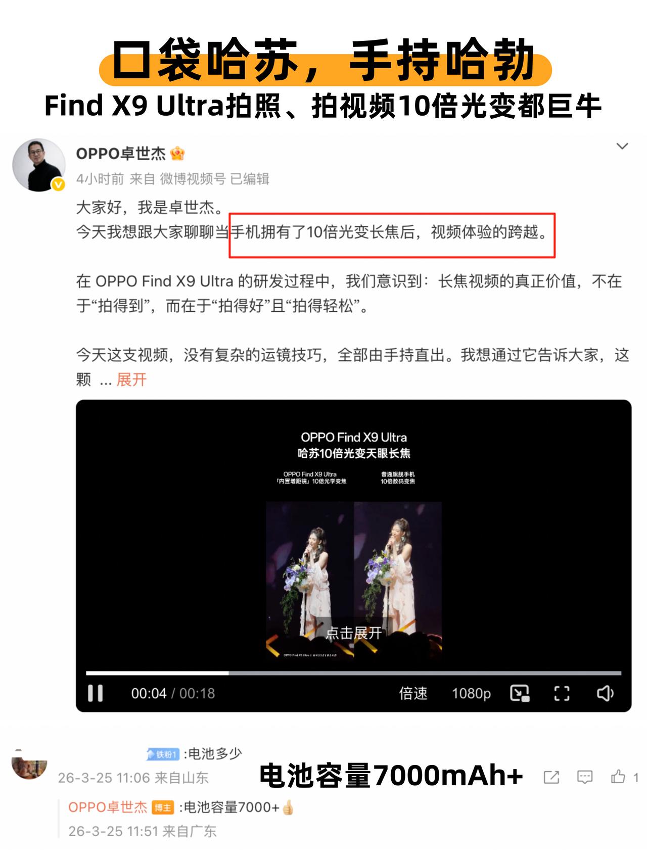 这远拍,山顶票也能拍出内场VIP视角 近期一直在做看演唱会的攻略,本来还在纠结要不要去租个长焦“大炮”, 结果一早起来刷到OPPO Find X9 Ultra的消息,瞬间觉得手里的S23 Ultra不香了!😂 - 整理了一下挖到的料,这两点真的狠狠戳中追星人了!! 📸 10倍光变到底有多猛? 之前用S23 Ultra,就是看中10倍光变长焦,演唱会神器 就是拍是能拍远,但进光量有局限,演唱会灯光较暗时还是很难拍出自己想要的大片🤔 这次OPPO不同 据说Find X9 Ultra这次给的10倍光学变焦,进光量是S23U的3倍多,裸机就能拍很远 内置增距镜的实力体验, 关键是拍视频也不糊,对追星女孩来说太友好了。 - 🔋 7000mAh+ 大电池,续航安全感给够! 追星最怕什么?最怕演唱会还没开场,手机扫个码就没电了。😭 OPPO高管透露电池有7000+mAh,配上百瓦快充,看完三小时演出估计只用一半电量?不用背着沉甸甸的充电宝满场找插头,真的太懂重度用户了! 这次Find X9U难怪说是冲「口袋哈苏,手持哈勃」打造的,感觉可以换了~~4月份发布也快了吧!? 演唱会神机 OPPOFindX9Ultra 10倍光变 三星S23Ultra长焦拍照 山顶票变内场 明星现场
