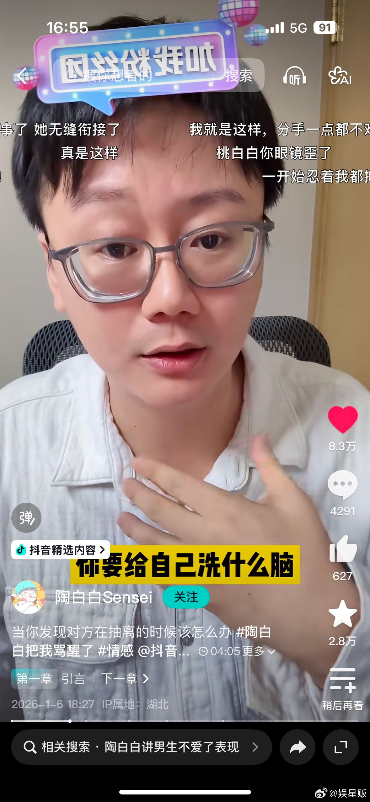 陶白白本身对亲密关系、人性心理的解读就很细腻,他最擅长的就是把我们说不出口的委屈、看不清的套路、藏在心底的执念,用很清醒又很温和的方式讲出来。在这期关于断崖式分手的内容里,他没有站在旁观者的角度轻飘飘安慰,而是直接点破了很多人在感情里的误区,也给出了真正能保护自己、减少伤害的实操思路,看完会有一种突然被点醒、心里踏实下来的感觉。
