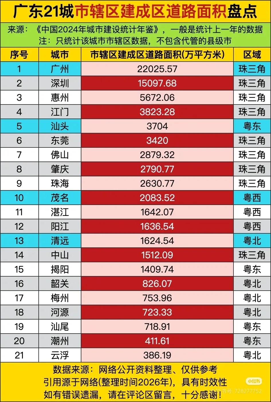 广东省21个市辖区建成区道路长度和面积排行榜。前九名均为珠三角八城加省城副中心城