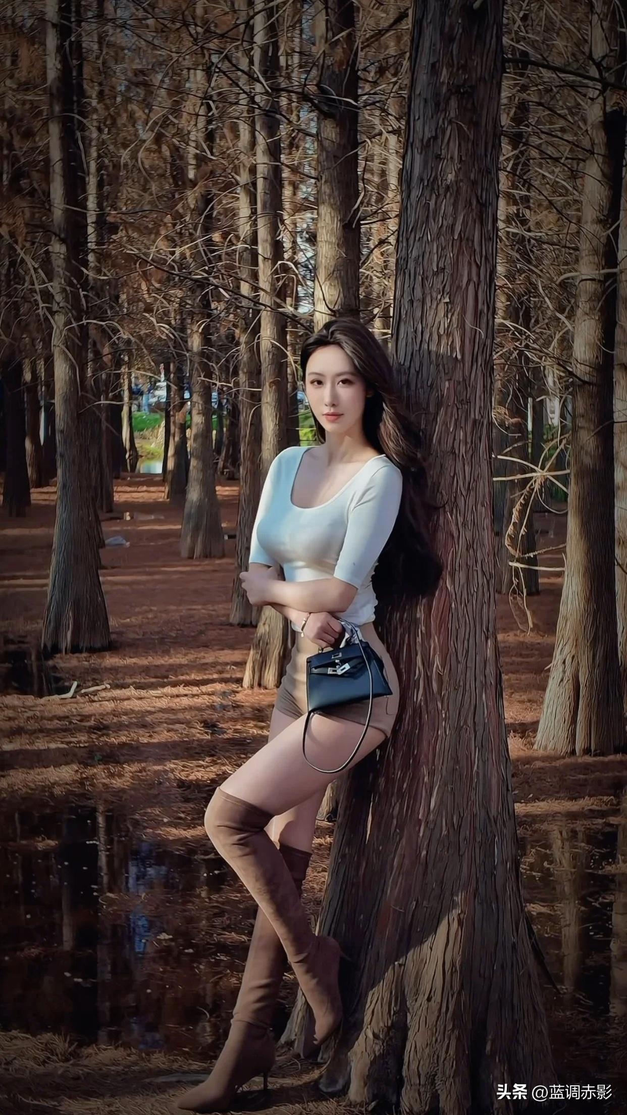 秋日森林中的时尚少女,轻松自在,享受自然之美。