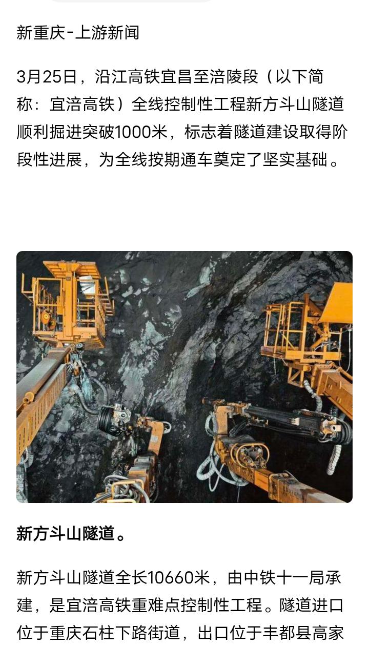 直达高铁,湖北宜昌途经恩施至重庆涪陵正在修建一条时速350公里的高速铁路,目前全线进展顺利,控制性工程全长10.6公里方斗山隧道已经掘进1公里,全长约1.8公里的涪陵长江公铁两用桥正在全速浇筑主桥墩,控制性工程14公里的石柱隧道、11公里的恩施隧道、9公里的鹤峰隧道、长阳清江特大桥等重点工程正在有条不紊的建设中,2030年建成开通运营后重庆坐高铁来往宜昌和襄阳的时间将缩短至2小时左右,沿途的长阳、鹤峰、恩施、利川和石柱将结束不通高铁的历史,对沿途城市区县的旅游和经济达发展也能起到重要的作用,宜涪高铁长阳至石柱段多为大山路段,桥隧比高建设难度大,期待如期建成开通运营。