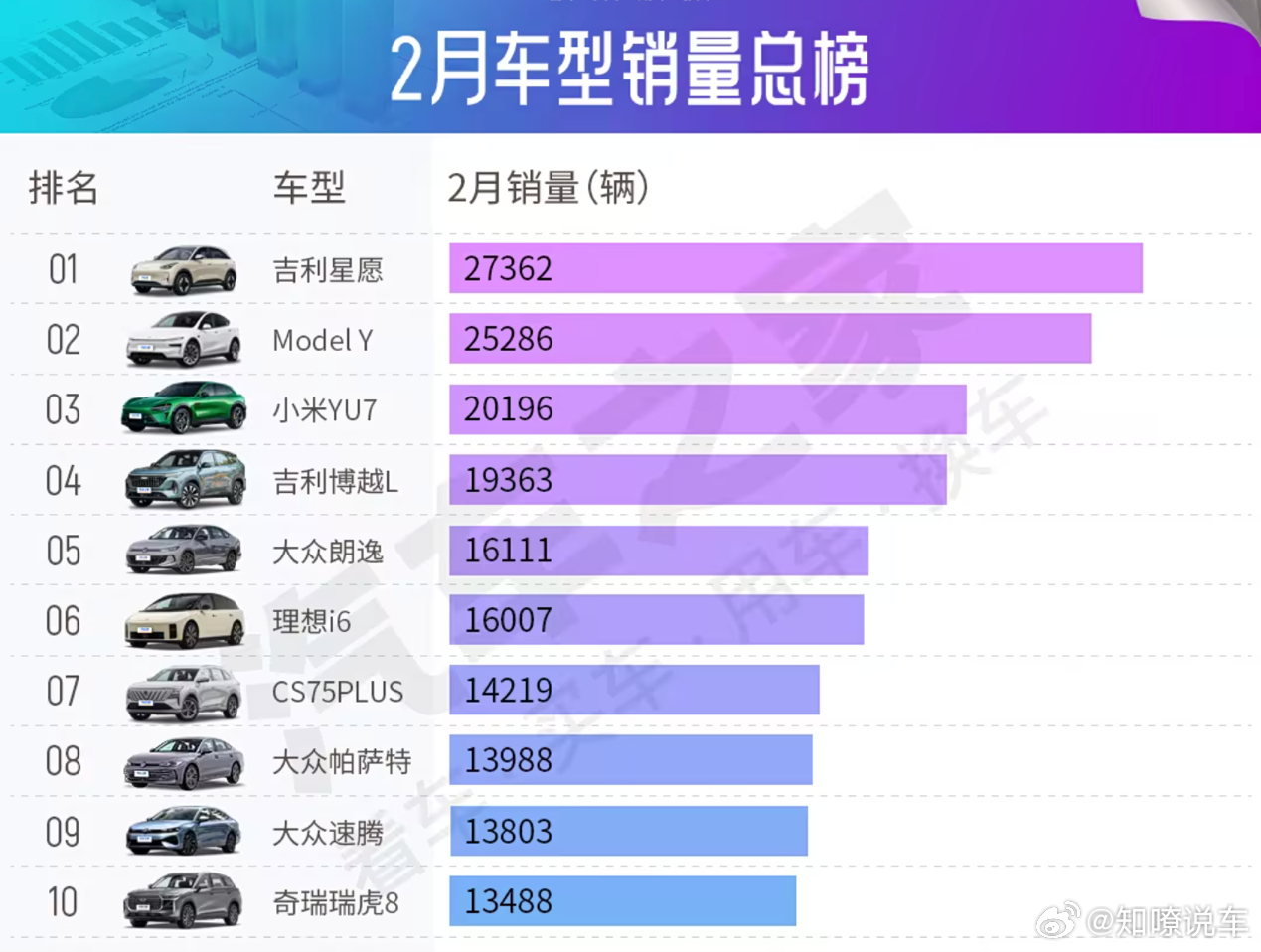 2月汽车销量总榜,吉利榜一/小米前三,燃油车明显回暖乘联会最新数据显示,2月新能