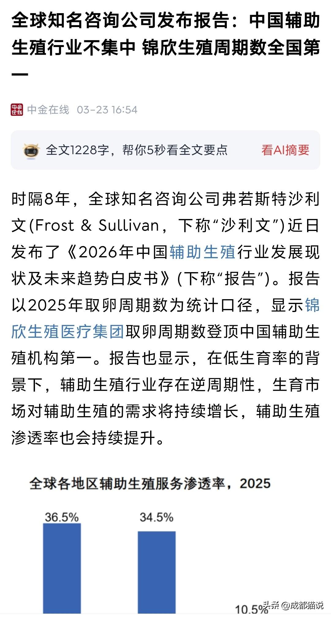 全国600多家试管婴儿机构,西部第一就在成都! 全球知名咨询公司弗若斯特沙利文近日发布《2026年中国辅助生殖行业发展现状及未来趋势白皮书》,这是近8年来首份覆盖全行业的系统性报告。 报告以2025年取卵周期数为统计口径,对全国辅助生殖机构进行了全面梳理。数据显示,四川锦欣西囡妇女儿童医院在中国西部地区位居第一。 报告同时指出,目前我国年周期数达到一定规模的持牌机构不足20家,占全国635家辅助生殖中心的比例不到3%。行业稀缺性正由牌照资源向规模化与技术能力转移。 对于关注辅助生殖领域的家庭来说,这份报告提供了权威的行业参考。