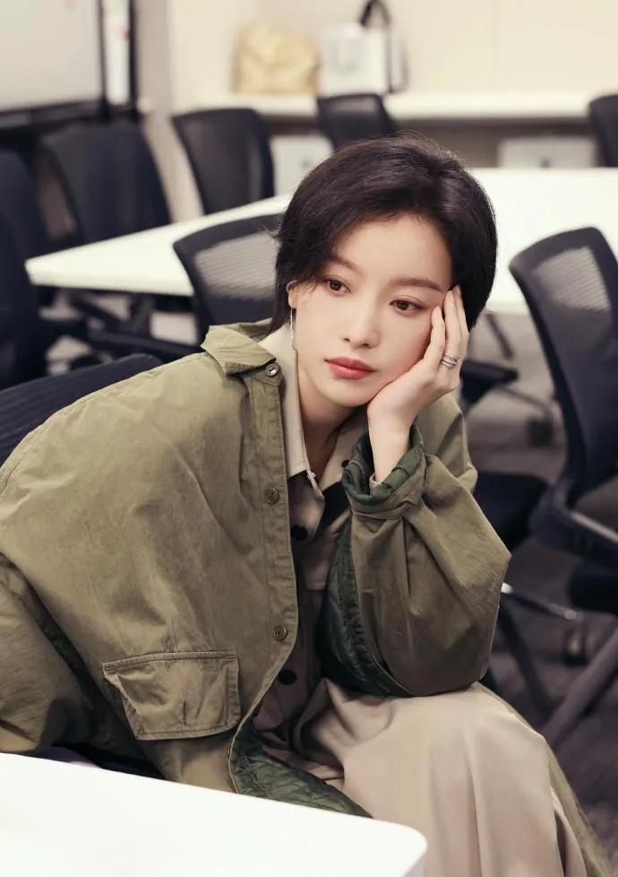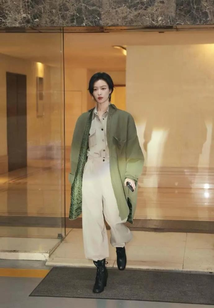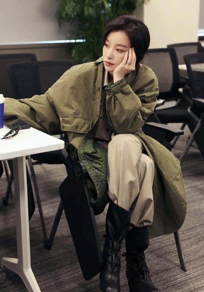 倪妮短发军绿风衣造型太绝了 倪妮这组造型直接封神!✨ 利落短发搭配军绿风衣,