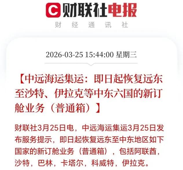 中远海运集团恢复中东六国新订舱业务霍尔木兹海峡通航在际 3月25日下午16点,中远海运集团官网上称,恢复自3月初中东六国沙特,卡塔尔,阿联酋,科威特,伊拉克,巴林的新订舱单业务。根据国际惯例,中国宣布撤侨哪就是战争要开打了。而现在央企宣布恢复订单,至少说明中远海运的船通行霍尔木兹海峡和伊,美谈妥了。厉害了我的国!
