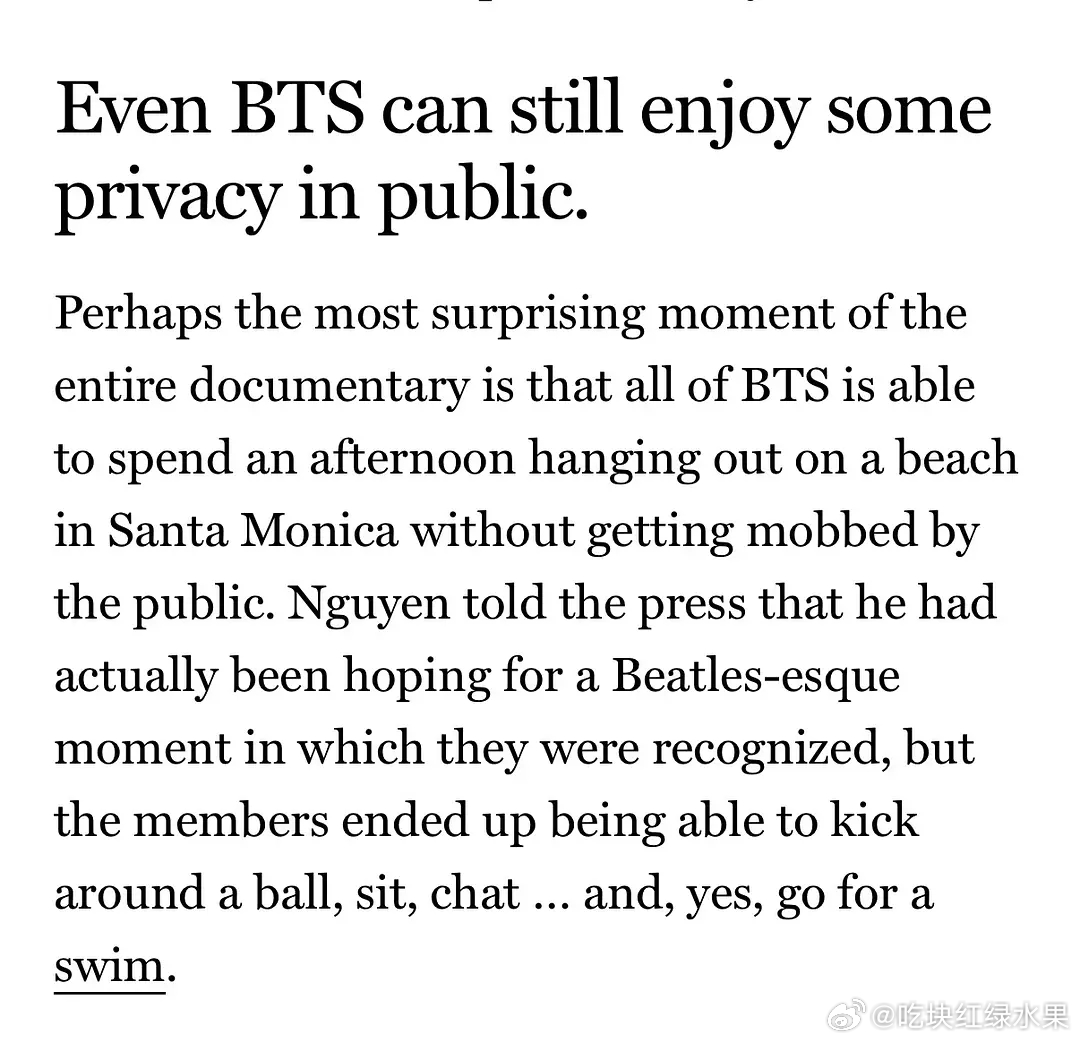 BTS纪录片Nguyen导演告诉记者,最令人惊讶的时刻或许是:BTS 所有成员花了一个下午在圣莫尼卡的海滩上闲逛,却没有被公众围堵。导演曾期待能出现一个披头士式的被路人认出的场景,但没有,成员们最终得以踢踢球、坐坐、聊聊天……当然,还游了个泳。。。