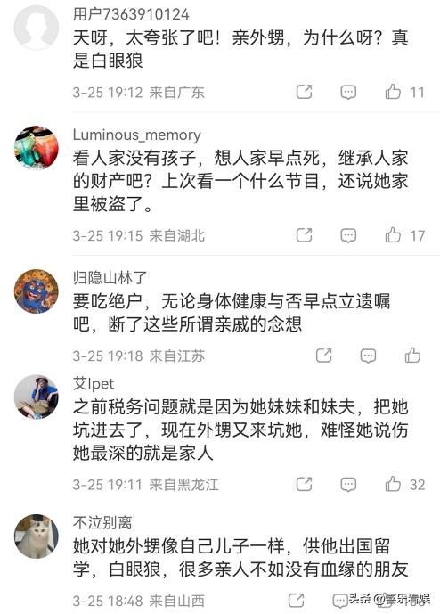 也有人分析:“看人家没有孩子,想人家早点死,继承人家的财产吧?上次看节目还说她家里被盗了”