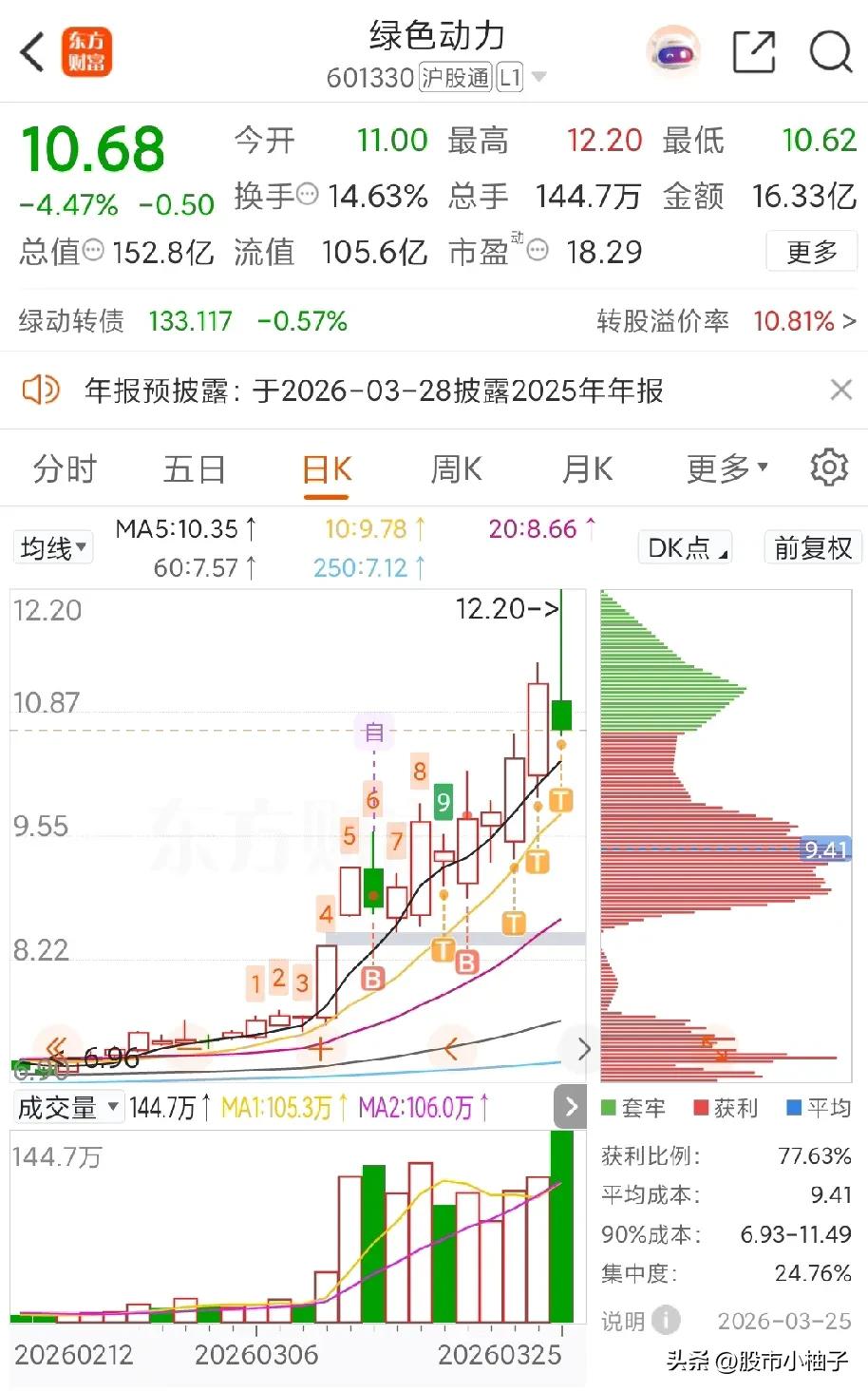 绿色动力启动上涨时买入,每天沿着5日线向上,走势很好! 我的操作就是启动后择机买入,但是不能满仓,一旦满仓,一个下杀就非常难受!于是可以买入2成仓位,如果沿着5日线良性向上,可以适当在低位再加入2成仓位,等拉高时再卖出2成仓位!如果回落到低点,那么可以再加上2成仓位! 这样就有了4成仓位,如果第二天低开,果断加入4成仓位,上涨后再卖出4成仓位!这样的话,我的底仓4成不懂,4成做t,另外的2成作为后手! 本来这几天做的不错,昨天也减了仓位! 但是今天盘中上涨到9个点时,没有及时卖出,还幻想着涨停,这就有点贪了,好几次都是这样,哪能卖到最高点,又来因为耽误了一下,发现绿色动力竟然一字断魂刀,杀到水下4个点,来不及了! 看日k线有长长的上影线,那么这种情况很不妙,就算明天有利好,也不去赌了! 我唯一需要做的就是赶紧离开!卖出能卖的,今天进的卖不了! 来回浮动一下,几千没有了! 炒股大师利物莫说过,当危险来临时,不思考,先躲开,等稳定后在进入! 他还说,他赚大钱的诀窍不在思考,而在安坐不动!我确实感觉到了,钱是坐着赚的,不是交易赚的,特别是频繁交易!