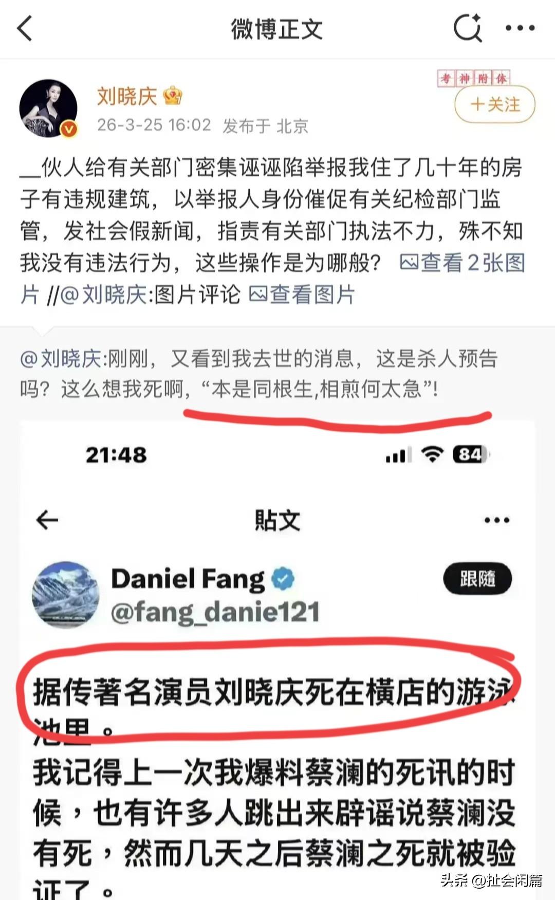 刘晓庆公开自己的外甥造谣自己去世,斥责说:就这么想我死吗?本是同根生相煎何太急! 刘晓庆公开了家庭内部的矛盾,而且晒出了对话记录,说是自己的外甥靖然造谣自己死亡。她愤怒的说:对方不光造谣自己去世,还举报自己的别墅违法,各种骚操作,不知道到底想干什么。 网友纷纷给刘晓庆支招,赶紧订立遗嘱,1分钱也不能留给这些白眼狼。 众所周知,刘晓庆和同父异母的妹妹刘晓红,原来出双入对,如影随形,外甥靖然留学的费用,刘晓庆说都是她出的,不知道为什么两家人现在闹得这样。 去年刘晓庆参加综艺节目,曾经说家里人比外人还狠,不知道是不是跟现在说的这些事儿有关。