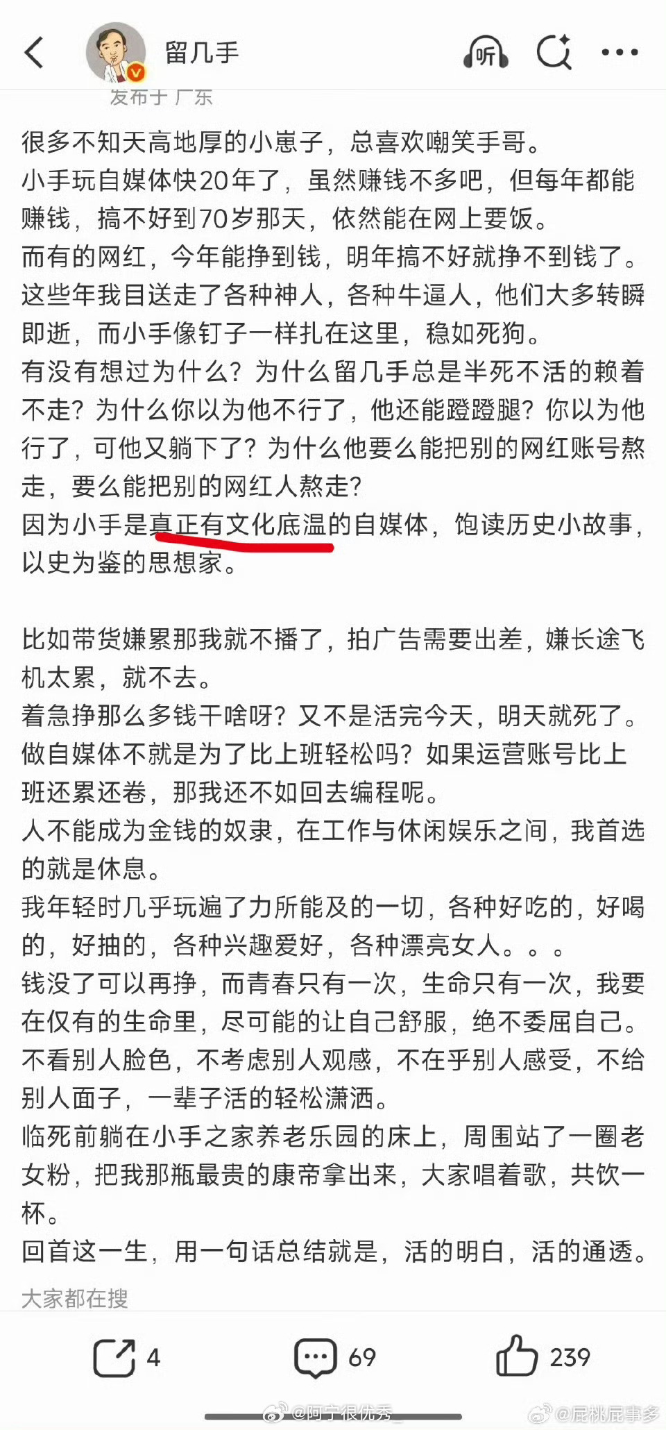 留几手:小手是真正有文化底温的自媒体....
