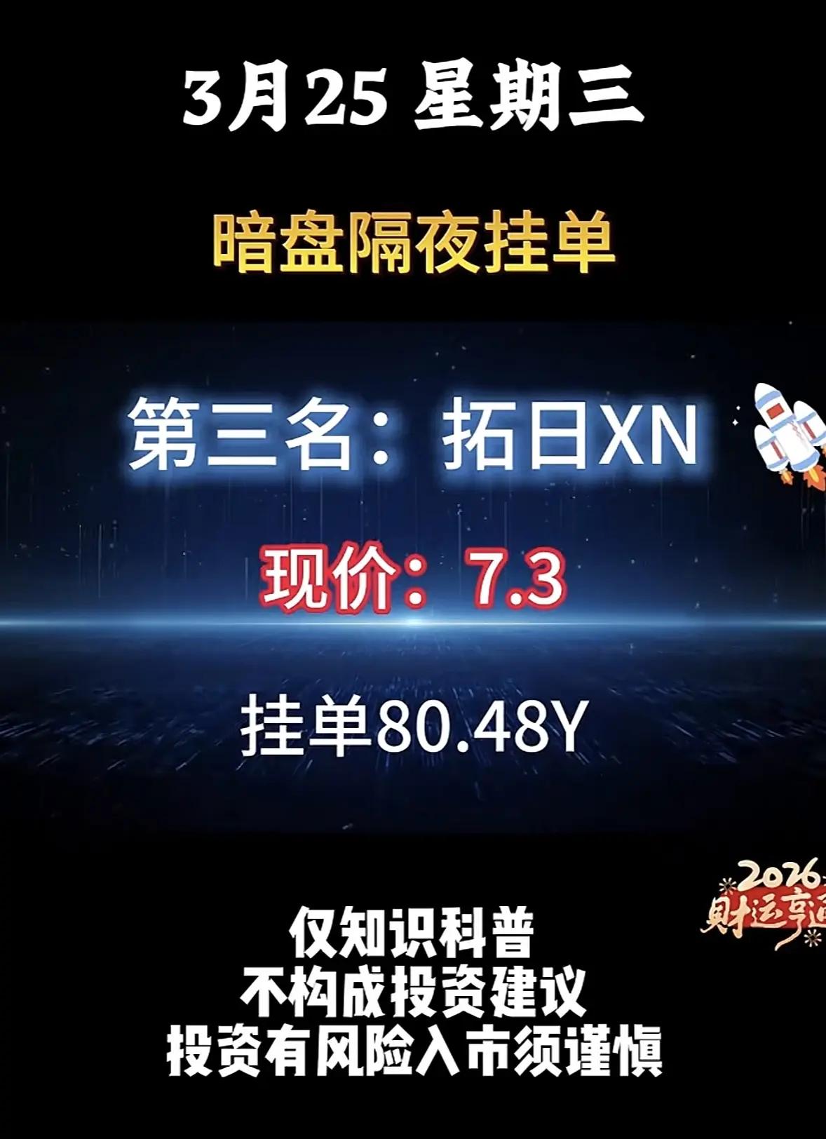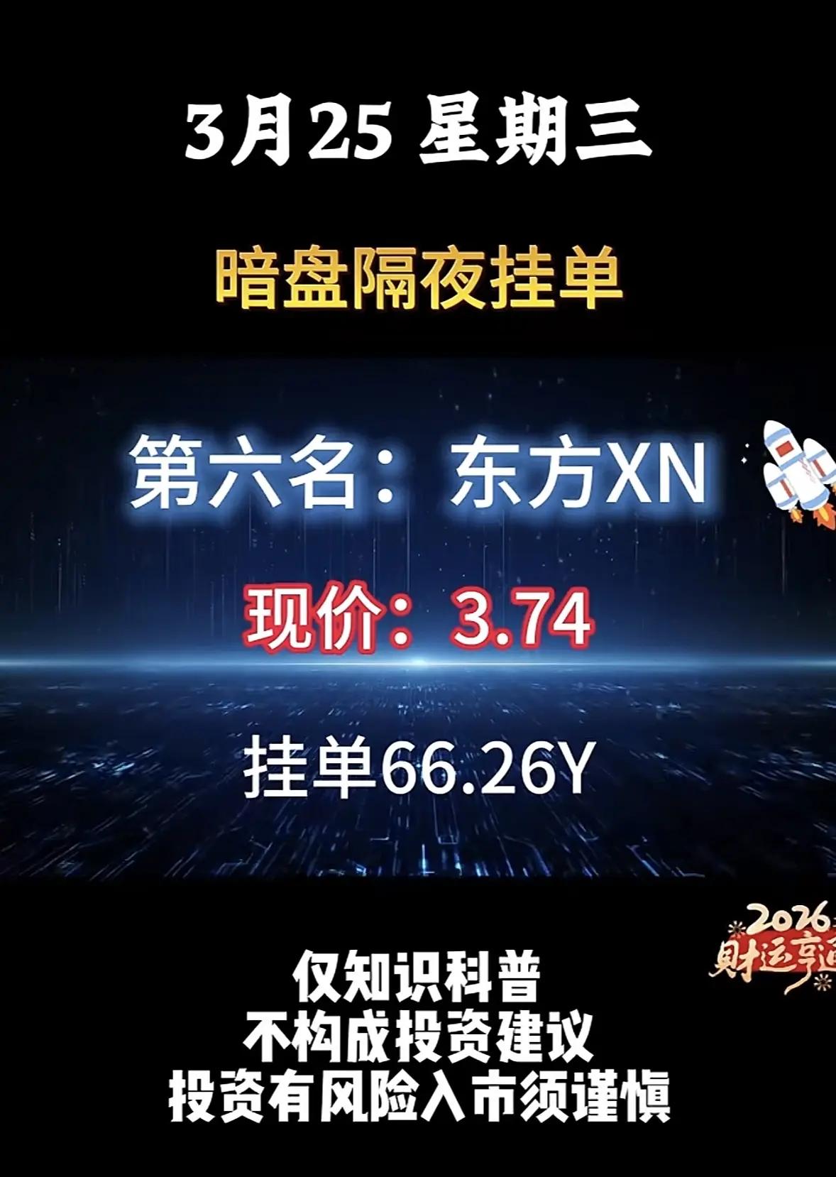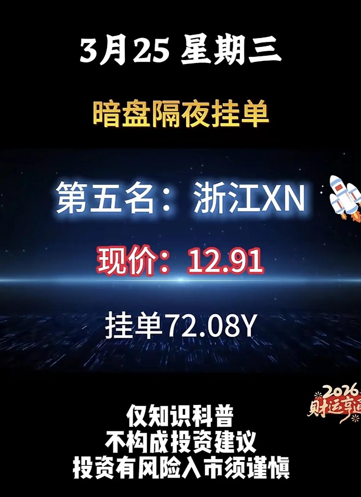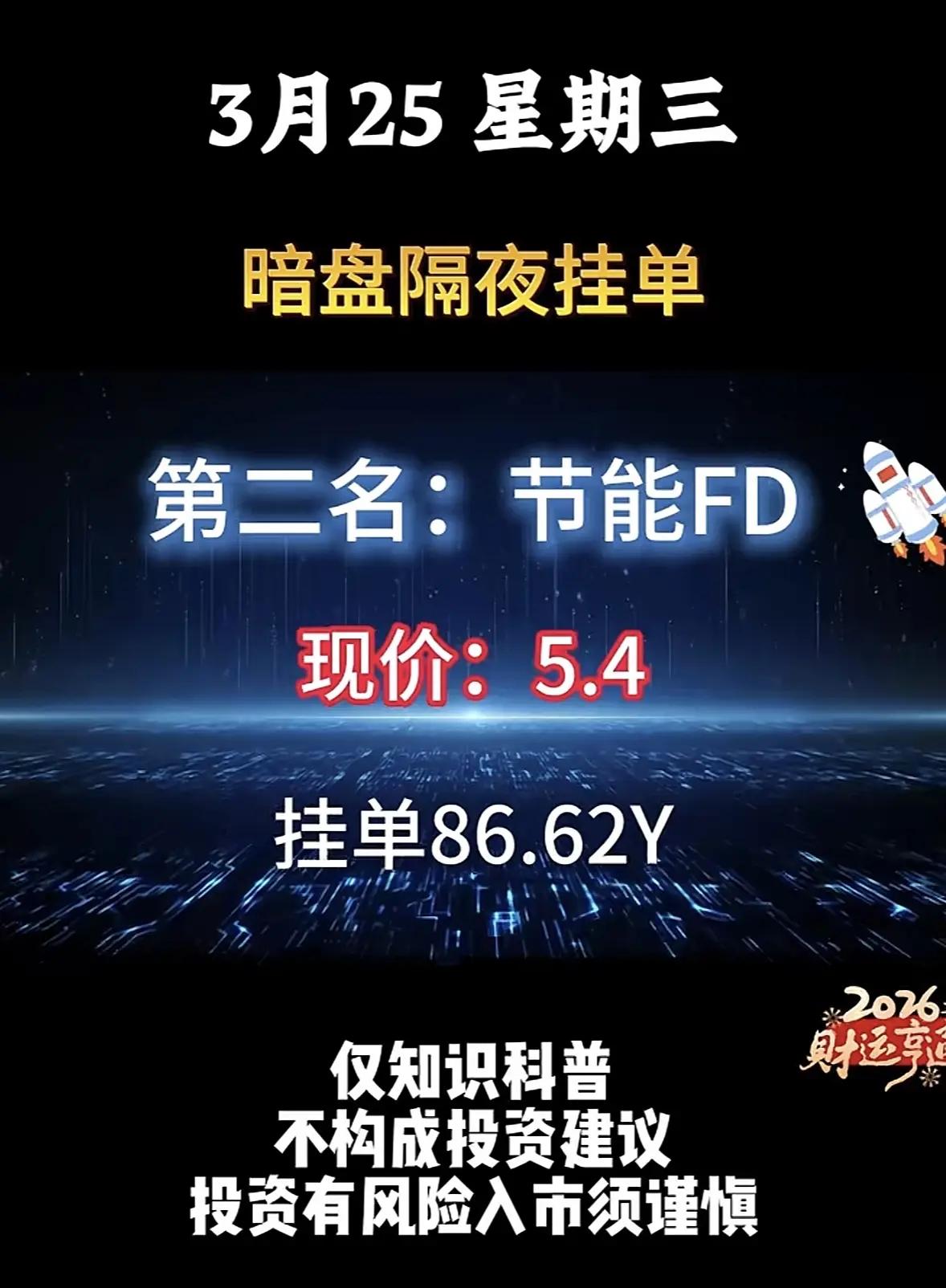 3月25日暗盘隔夜挂单解析📊 3月25日暗盘隔夜挂单数据显示,新能源赛道成为资金核心追捧方向,前六名均为新能源相关标的,整体挂单规模极高,市场情绪偏向乐观。 - 头部效应显著:华电LN以99.88亿挂单量位居榜首,节能FD、拓日XN紧随其后,挂单量分别达86.62亿、80.48亿,前三名挂单均超80亿,资金对核心新能源标的的关注度高度集中。 - 低价标的受青睐:东方XN(3.74元)、节能FD(5.4元)等低价股挂单规模靠前,反映出资金更倾向于布局低估值新能源品种。 - 板块集中度高:金开XN、浙江XN等标的也进入前五,新能源板块内部形成了较强的资金联动效应。 ⚠️ 风险提示:此类暗盘挂单数据仅为市场情绪参考,不具备实际法律效力与交易效力,存在信息误导、滞后性等问题,投资者需理性看待,切勿据此盲目操作,市场有风险,入市需谨慎。
