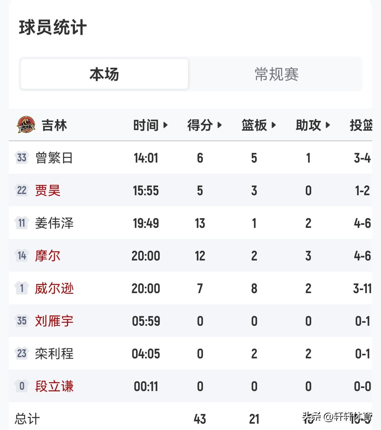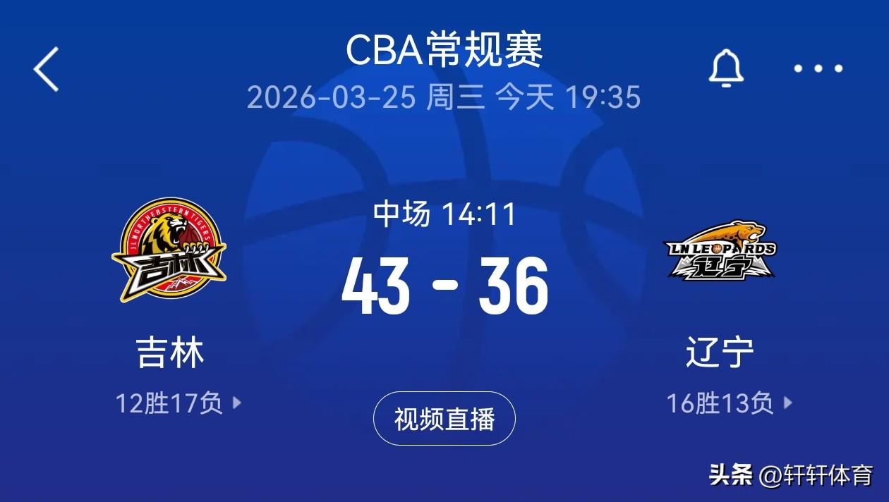CBA东北德比半场比赛已经结束,双方队员在非常友好的氛围中,比赛打的非常激烈,半场比赛结束主场作战的吉林男篮以43-36领先辽宁男篮7分,辽宁男篮本场比赛11人参与轮转,其中7人有得分,8号外援布罗金顿拿到了8分4篮板1助攻的数据,莫兰德7分8篮板1助攻,付豪与威尔斯各得到6分,姜宇星4分,赵继伟3分3助攻,张陈治锋2分2篮板,吉林男篮8人参与轮转5人有得分,姜伟泽拿到了全场最高的13分,摩尔12分,威尔逊7分8篮板2助攻,曾繁日6分5篮板1助攻,贾昊5分3篮板。