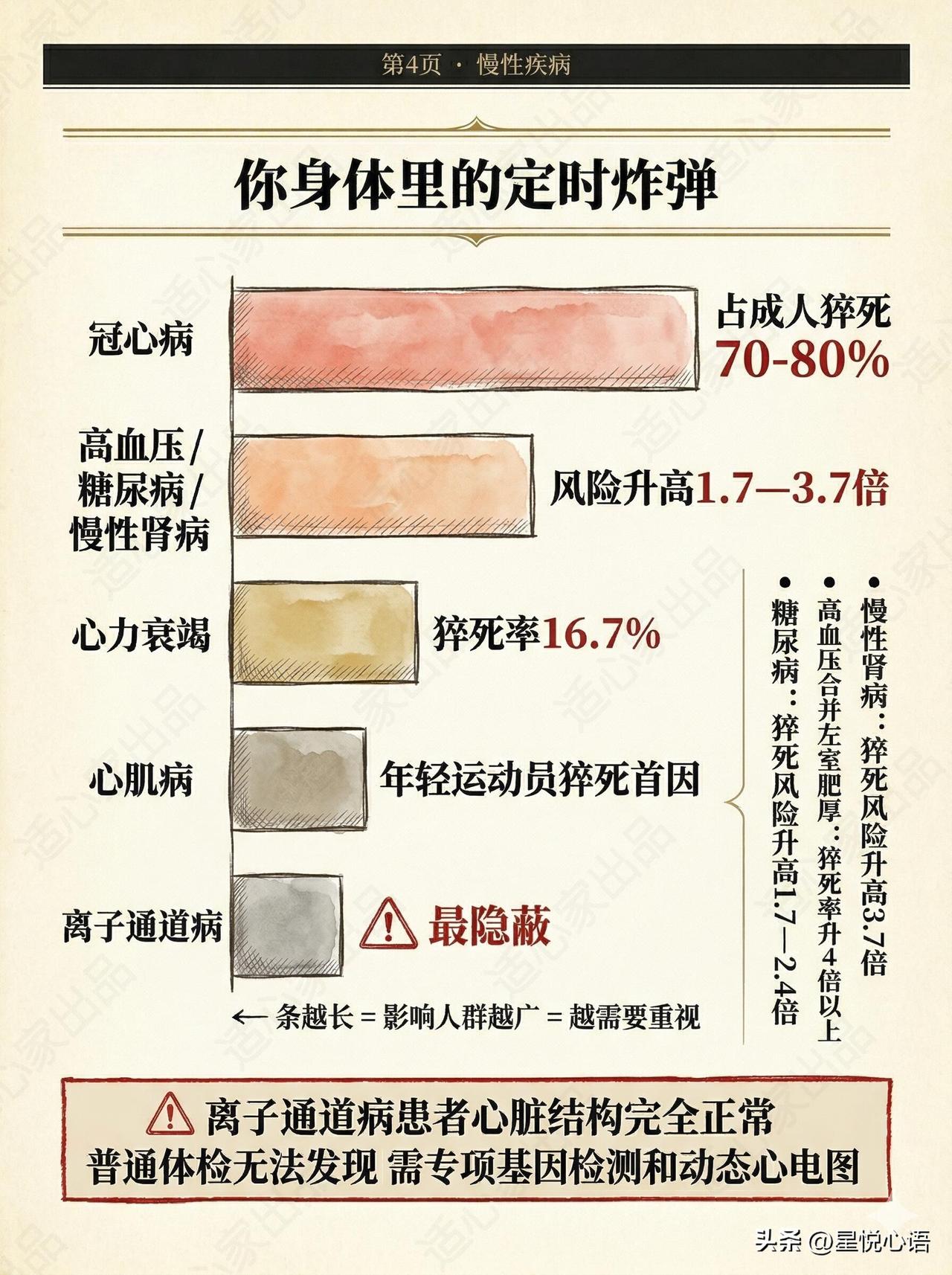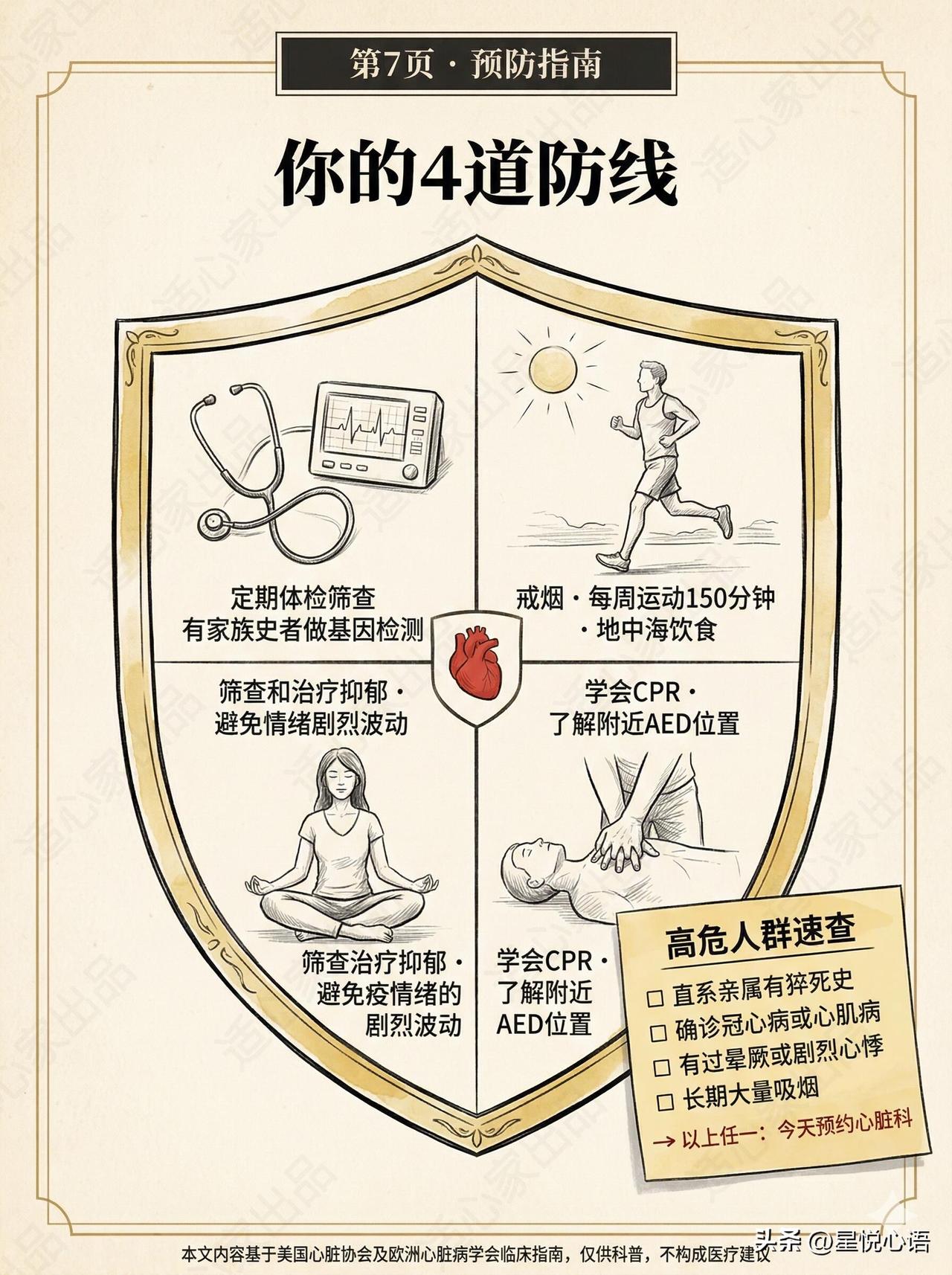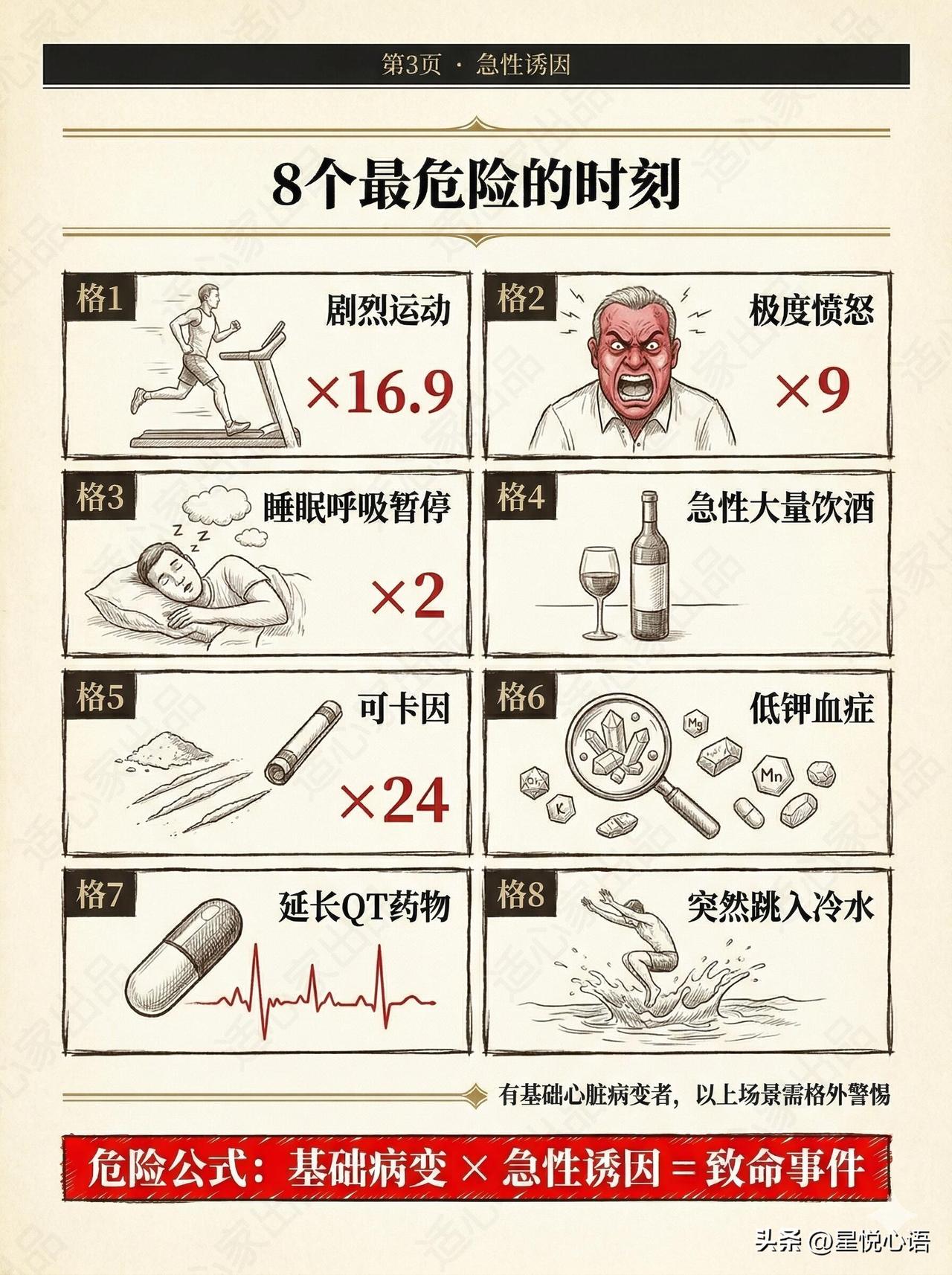 心源性猝死真的太凶险了! 全球每年超400万人中招,占心血管死亡60%以上,发作到离世往往不到60秒,不少人倒下前毫无预警。 猝死从不是凭空发生,是基础心脏病变遇上急性触发因素,而这些基础问题,普通体检根本查不出来。 冠心病、有家族猝死史的要警惕,吸烟、三高人群也别大意,慢性肾病这个诱因还特别容易被忽略。 这些高危时刻也得记牢:剧烈运动时风险骤升16.9倍,但规律运动反而能降54%;极度愤怒后2小时风险涨9倍,就连睡眠中也可能发作。 万幸的是,预防的效果特别明显! 坚持不吸烟、适量运动、控体重、吃地中海饮食,猝死风险能降92%,吃药前也多留意药物诱因。别觉得猝死离自己远,作息乱、压力大都是隐形隐患,把这些知识点转给家人,平安才是最珍贵的!