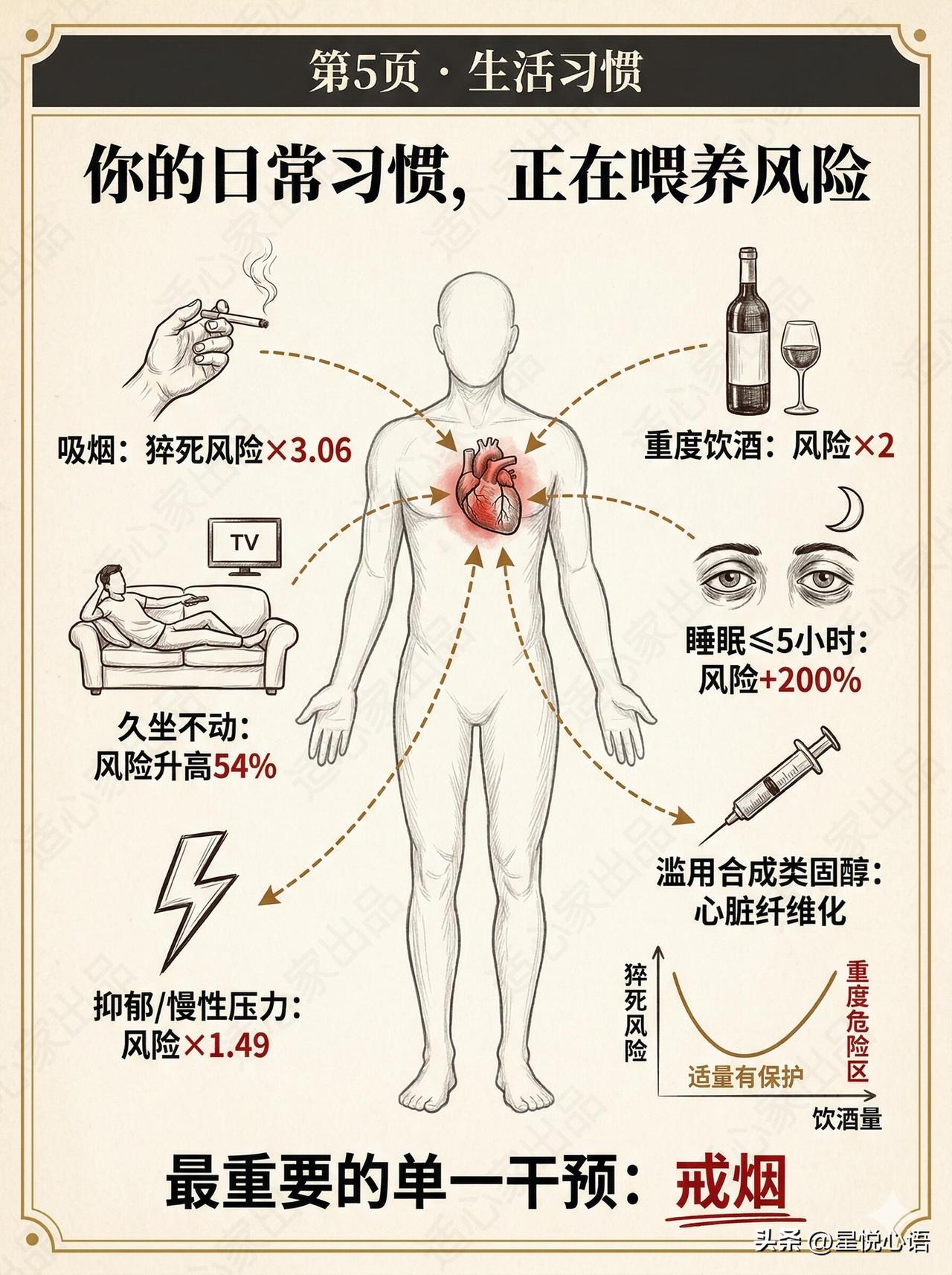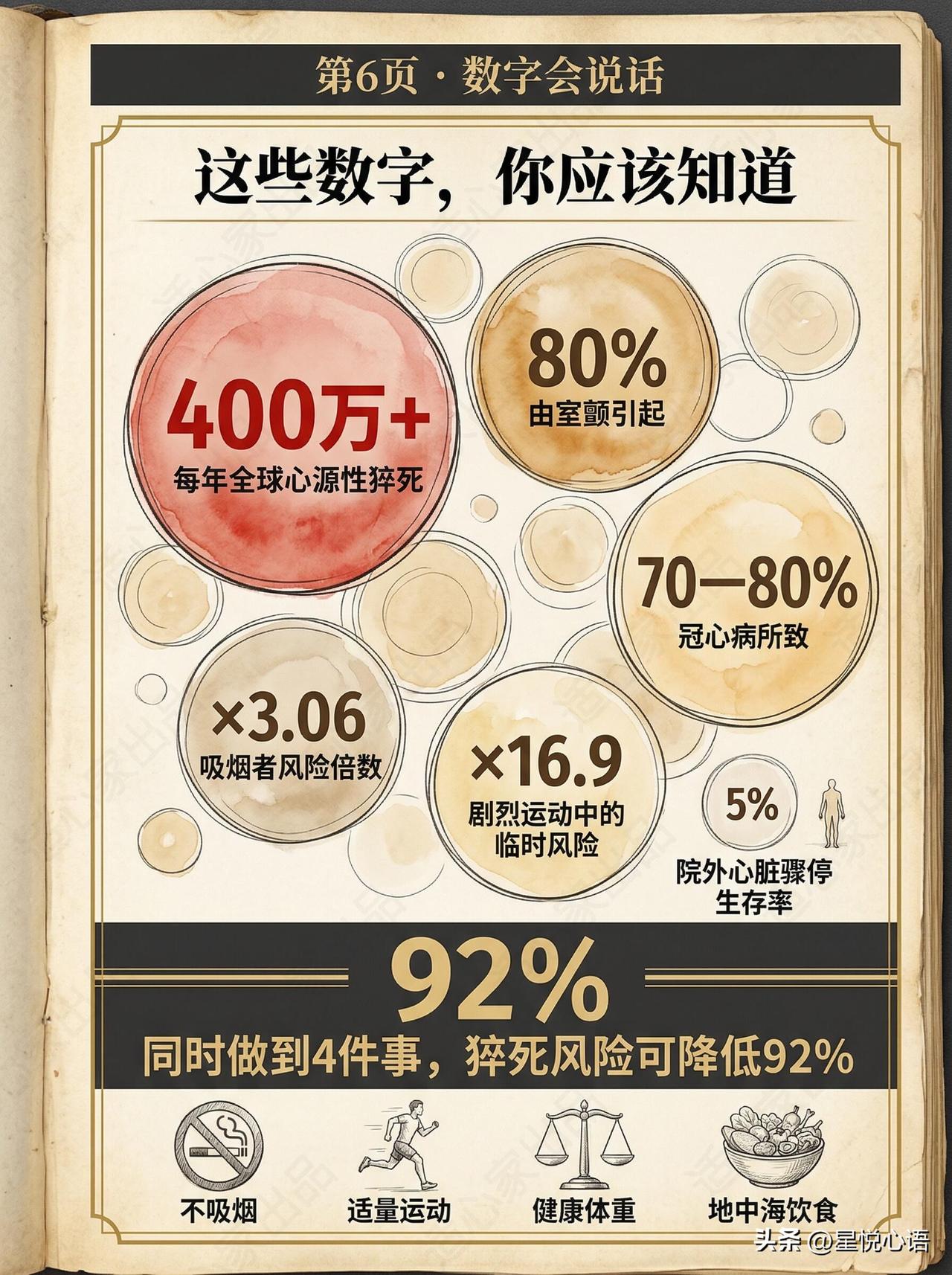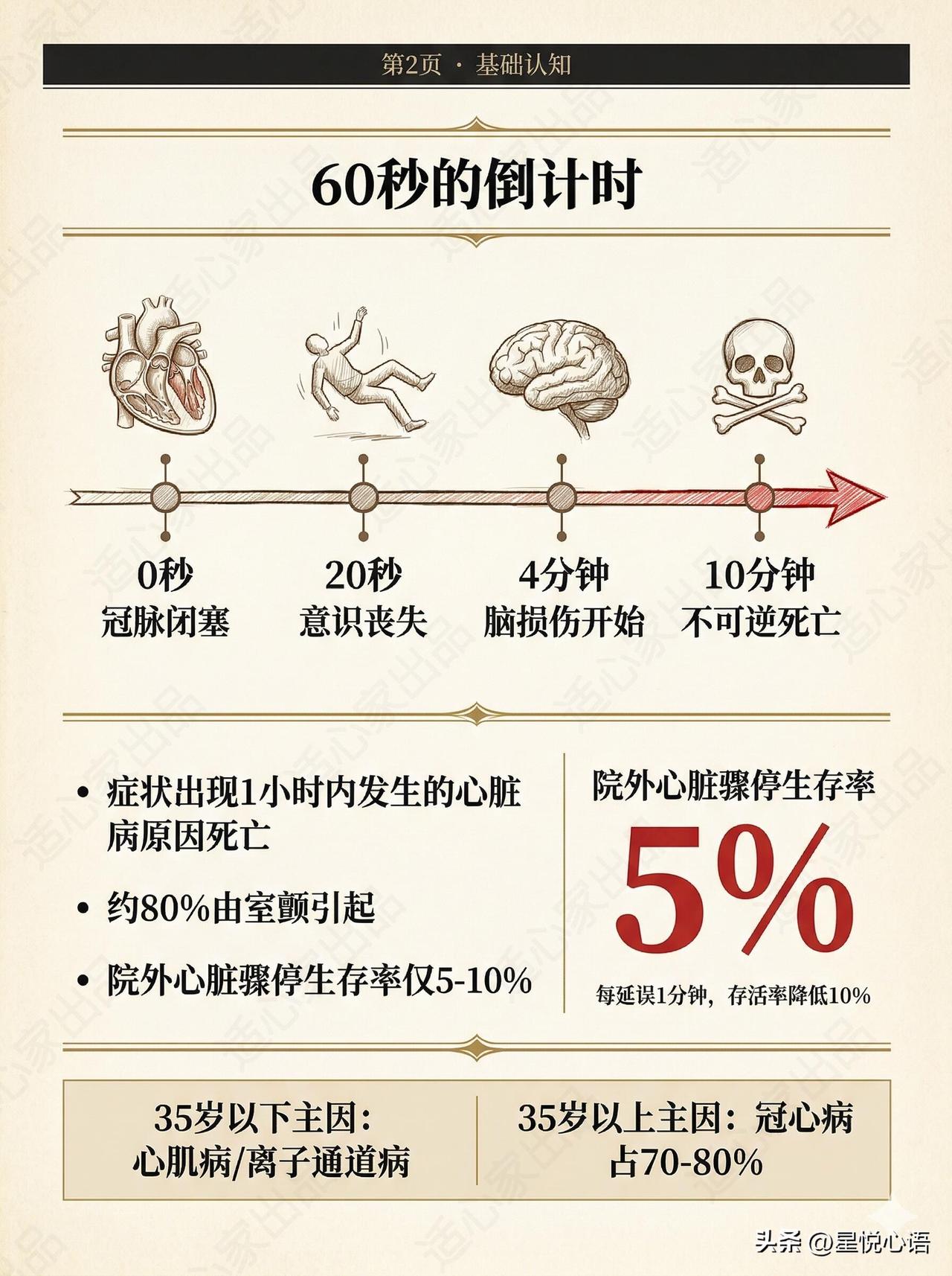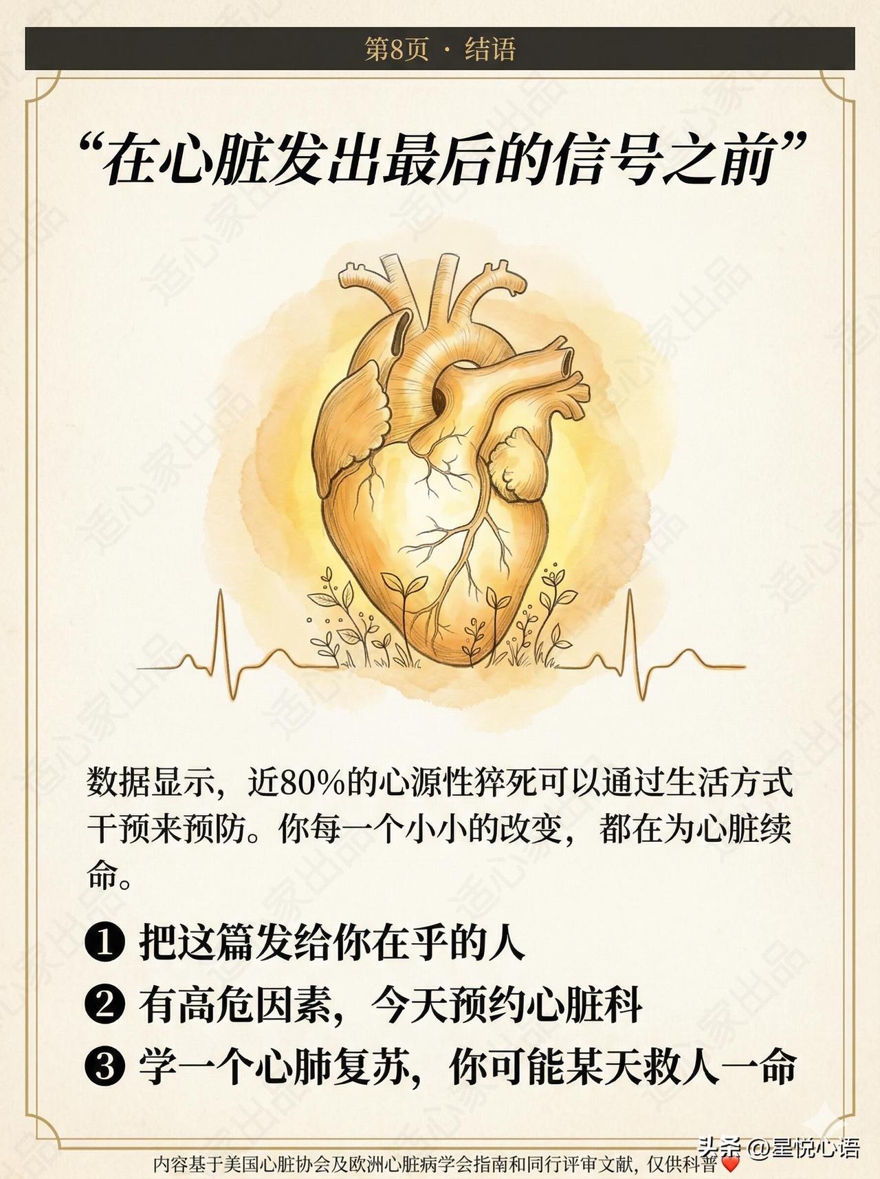 心源性猝死真的太凶险了! 全球每年超400万人中招,占心血管死亡60%以上,发作到离世往往不到60秒,不少人倒下前毫无预警。 猝死从不是凭空发生,是基础心脏病变遇上急性触发因素,而这些基础问题,普通体检根本查不出来。 冠心病、有家族猝死史的要警惕,吸烟、三高人群也别大意,慢性肾病这个诱因还特别容易被忽略。 这些高危时刻也得记牢:剧烈运动时风险骤升16.9倍,但规律运动反而能降54%;极度愤怒后2小时风险涨9倍,就连睡眠中也可能发作。 万幸的是,预防的效果特别明显! 坚持不吸烟、适量运动、控体重、吃地中海饮食,猝死风险能降92%,吃药前也多留意药物诱因。别觉得猝死离自己远,作息乱、压力大都是隐形隐患,把这些知识点转给家人,平安才是最珍贵的!