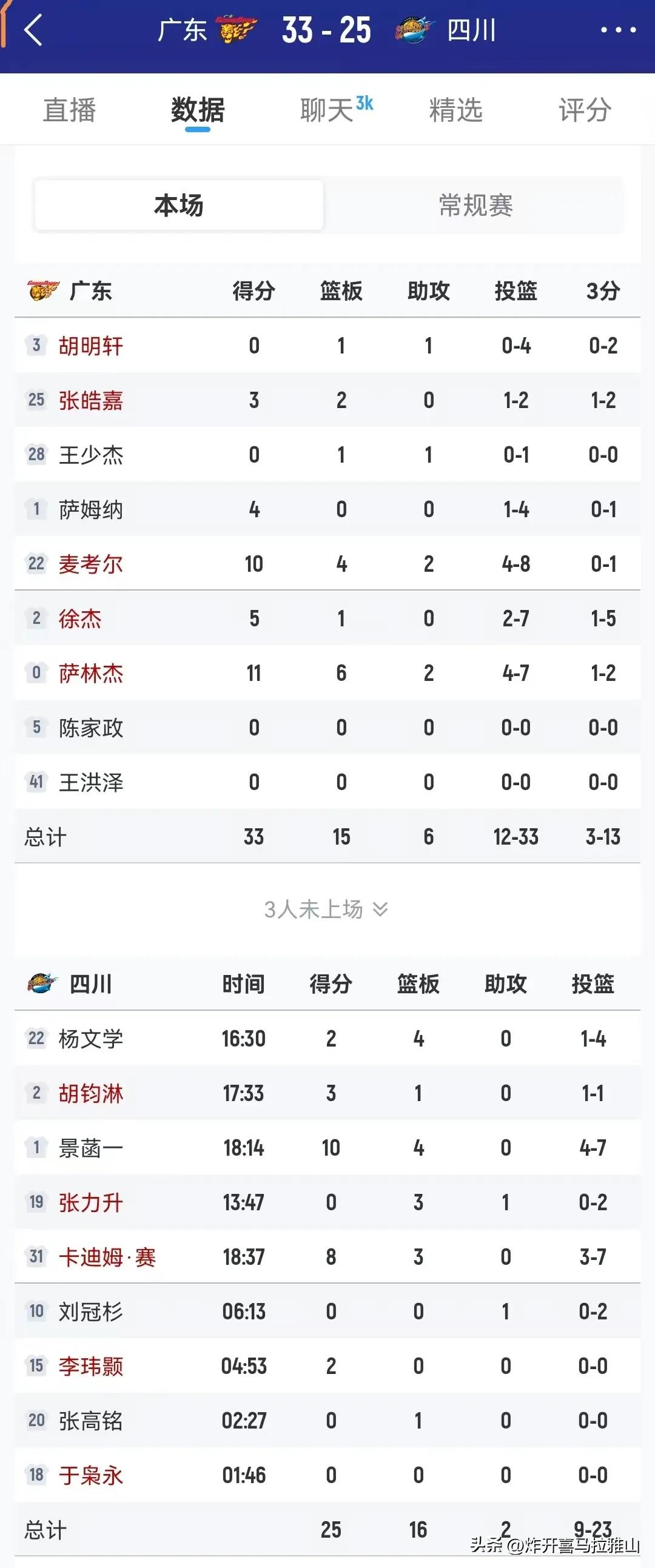 33-25,这是广东队主场打四川队的比分,让大家大跌眼镜,要知道四川队在赛季一场没赢,广东队排名第4。全队一盘散沙,可以肯定的是广东队更衣室出问题了! 广东队半场比分领先29连败的四川队8分,胡明轩4投0中,王少杰0分。萨姆纳4投1中,徐杰7投2中。三分球13投3中。其中篮板球15-16还输给四川队1个[捂脸][捂脸][捂脸]。 很明显广东队这不是实力问题,就是球员人心散了,都不好好打了,可能就是在给陈老板和朱芳雨看。倒数第二江苏肯帝亚都能输,倒数第一一场没有赢的四川队打的场面极其的被动。 本场比赛后,杜峰的帅位真的危险了。