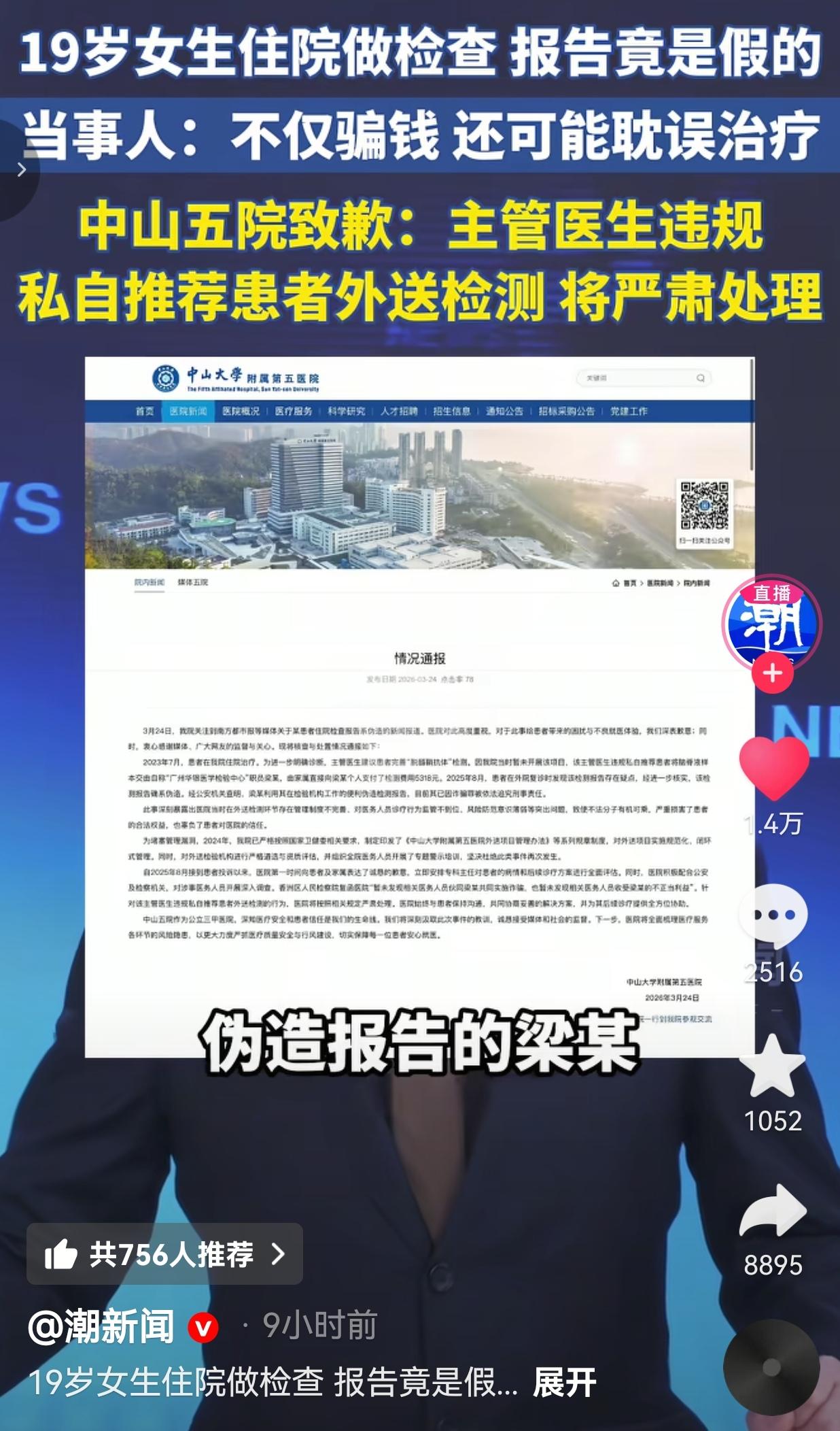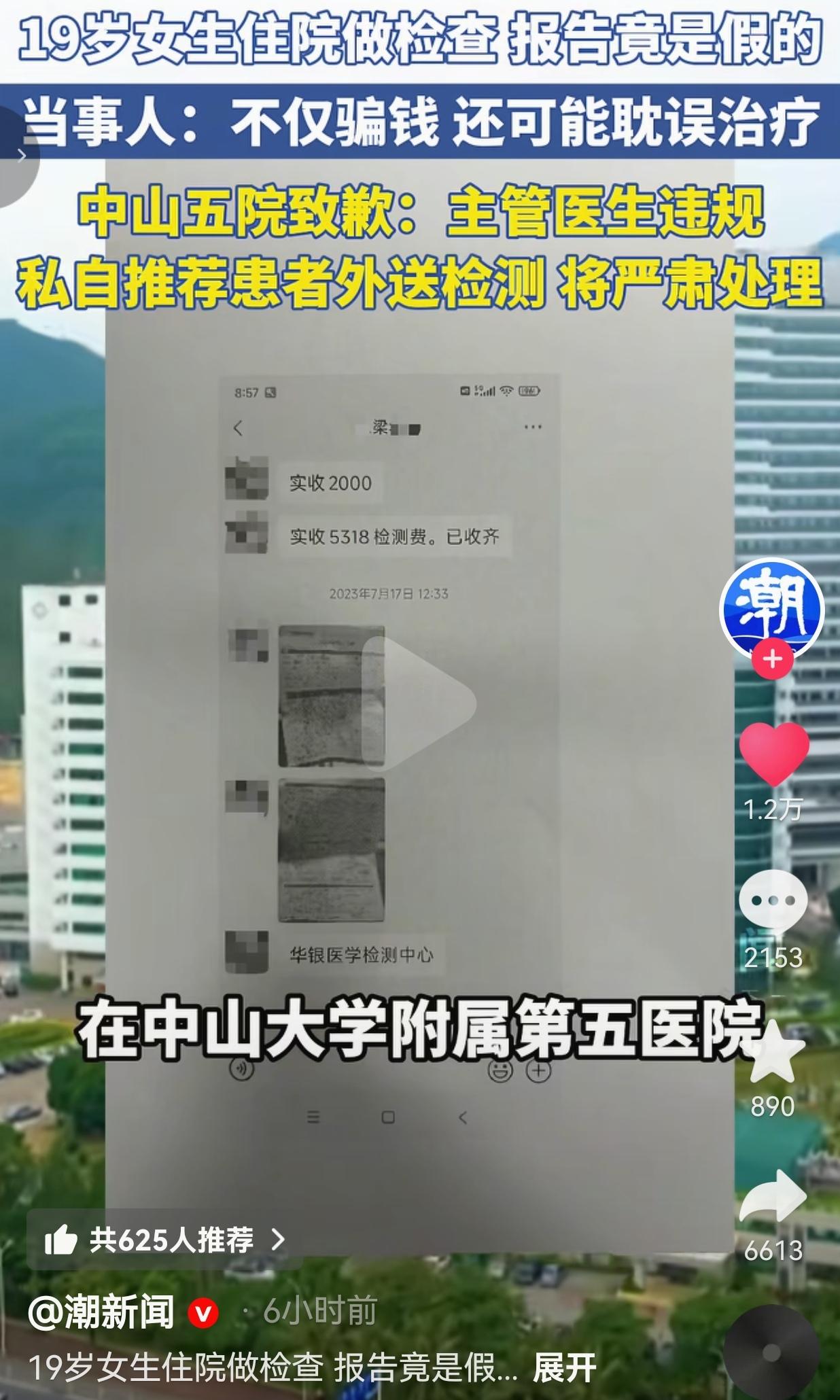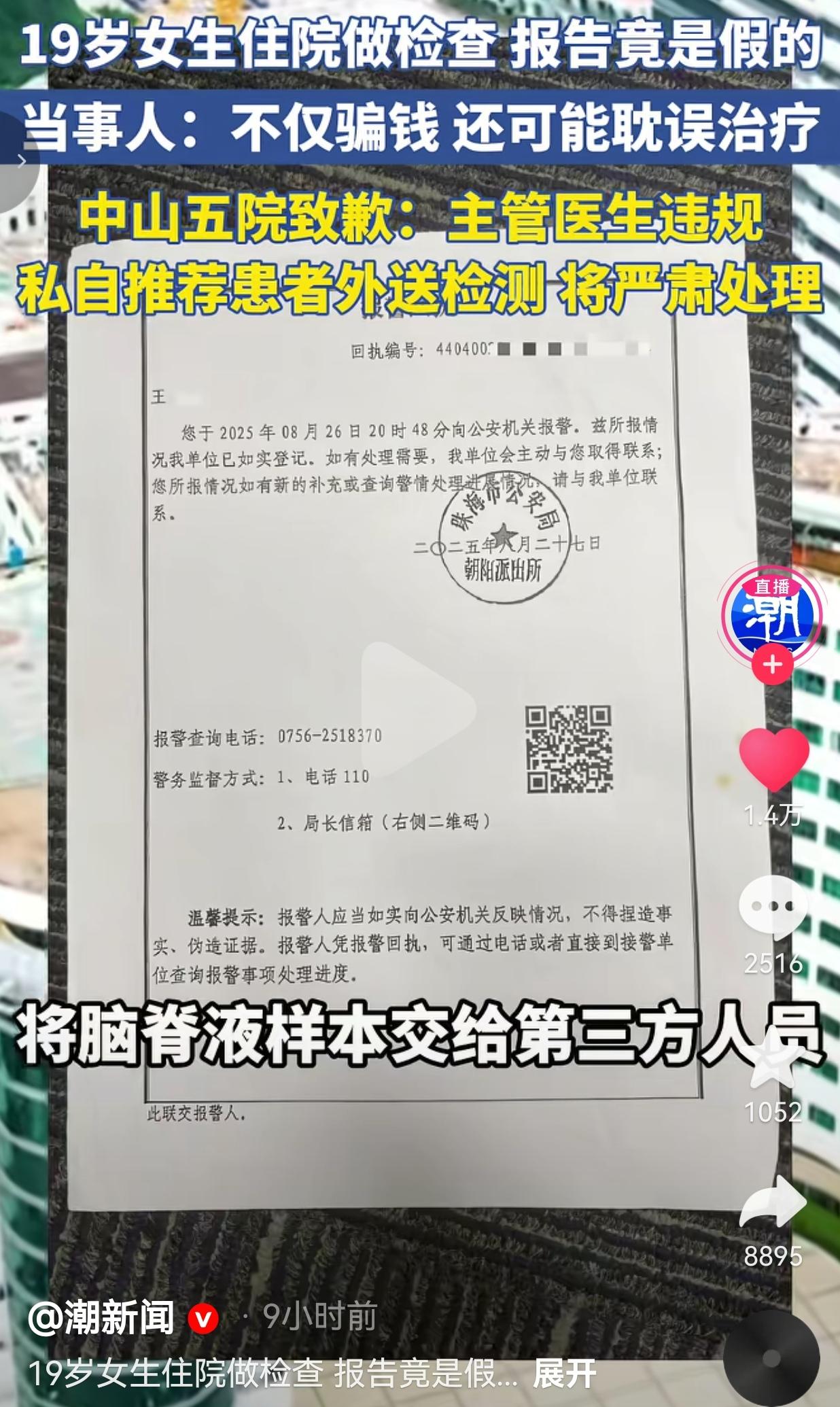 太荒谬了!19岁大学生住院做脑脊液检查,掏了5318块钱,等了两年复诊才知道——那份救命的检测报告,从头到尾都是伪造的!连伪造报告的第三方都被抓了,涉事医院却还在说“暂未发现诈骗和不当利益”? 2023年7月,19岁的姑娘小王因为病情未愈,住进了中山大学附属第五医院神经内科。 主管的蔡姓医生跟她说,得做个“髓鞘抗体”检测,能精准查病因,但这个项目医院暂时没开展,得自己掏5318块钱找第三方“华银医学检测中心”外送,不走医保。 小姑娘哪懂这些医疗套路?只想着赶紧治好病,乖乖把5318块钱打给了个人,还把珍贵的脑脊液样本亲手交给了医生推荐的第三方人员。 没过几天,盖着“华银医学检测中心”章的报告就递到了她手里,蔡医生拿着报告头头是道地分析病情,给她开了药。小王以为终于找对了方向,踏踏实实地吃了整整两年药。 直到2025年8月复诊,换了个医生,一看旧报告就皱起眉头:“这报告不对啊,我们系统里根本查不到这份检测记录,而且这个检测项目早就被淘汰了!” 小王当场懵了,疯了一样跑去报警、找第三方机构核实——人家明确说:根本没收到过她的样本,那份报告是彻头彻尾伪造的! 伪造报告的梁某,已经因诈骗罪被追究刑事责任了! 她不仅被骗了五千多块血汗钱,更可怕的是:这两年吃的药、做的治疗,全是基于一份假报告开的!万一耽误了真正的病情,谁来负责? 更让人火大的是,医院3月24日发的通报,轻飘飘一句“主管医生违规,私自推荐外送检测,将严肃处理”,还特意强调“暂未发现涉事医生存在诈骗及收取不正当利益行为”,就想把这事翻篇? 网友看到后评论说:“第三方都因诈骗被抓了,医生还说没不当利益?鬼才信!19岁的姑娘啊,刚成年就被这么坑,换我我得堵在医院门口讨说法!” 也有的网友说:“作为同行,我都觉得丢人!违规外送样本、放任第三方伪造报告,这已经不是医德问题,是帮凶!就算没直接拿钱,也得吊销执照,终身禁医!” 还有的网友说:“5318块,对普通家庭来说是几个月的生活费!医生一句话就骗走了,还耽误两年治疗,现在医院说“暂未发现”就想甩锅?这道歉能当饭吃?能治好病吗?” 也有的网友说:“现在去医院,医生说啥都不敢信了!生怕一不小心就被当成待宰的羔羊,连救命的脑脊液检查都能造假,还有啥是真的?” 这不是简单的“违规操作”,这是赤裸裸的谋财害命! 19岁的姑娘,抱着对医生、对三甲医院的绝对信任,把自己的健康和血汗钱交出去,换来的却是一份假报告、两年错药、一个随时可能爆发的健康隐患! 医生的天职是“救死扶伤”,不是“趁病打劫”!你坐在诊室里,穿着白大褂,手里握着的是别人的命,不是你给第三方牵线搭桥、赚外快的工具! 更让人心寒的是,医院的通报轻描淡写,一句“严肃处理”就想蒙混过关,甚至还在为涉事医生开脱。如果不是姑娘两年后复诊偶然发现,这事是不是就永远埋在土里了?还有多少像她一样的患者,被蒙在鼓里,吃着错药,耽误着病情? 我们普通人去医院,本来就带着恐惧和无助,我们信任医生,才愿意把一切交出去。可这份信任,现在被踩在脚下,被当成了牟利的筹码。连第三方都被判刑了,医院还在说“暂未发现”,这到底是在保护医生,还是在纵容罪恶? 医疗行业的底线,从来不是“不出事”,而是“不害人”。 当医生开始把患者当成牵线赚钱的工具,当医院开始用“道歉”和“暂未发现”掩盖失职,我们每个人都可能成为下一个小王。 我们要的不是一句轻飘飘的道歉,不是“严肃处理”的空话,是真刀真枪的追责:放任造假的医生必须付出代价,监管缺位的医院必须承担责任,还给受害者一个公道,给所有患者一个能安心看病的环境! 信任一旦碎了,再怎么粘,都回不到最初的样子。别让我们在医院里,既要对抗病痛,还要提防人心,更要看着造假者逍遥法外! 对此,你怎么看? 信息来源:潮新闻