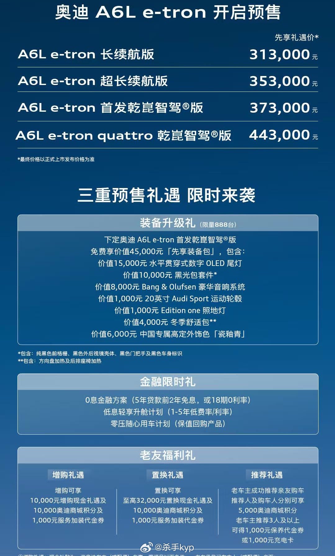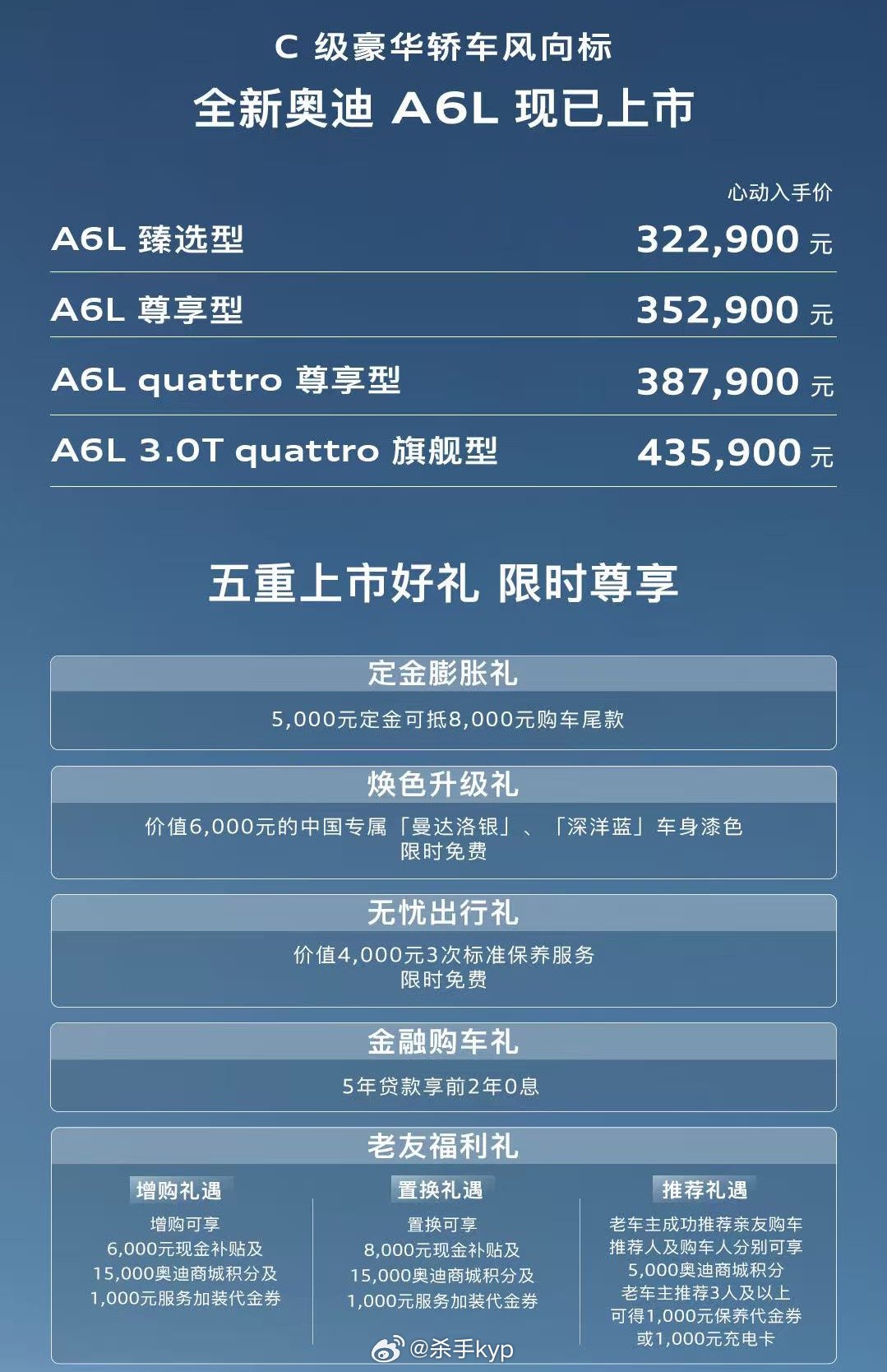 全新奥迪A6L上市 全新奥迪A6L正式上市搭载quattro与HDI双电机全域智混系统,270kW最大功率、550N·m峰值扭矩;同级独有S系列3.0T发动机,4.6秒破百,动力响应迅猛。31.99万元-43.29万元奥迪A6L e-tron搭载宁德时代三元锂电池,续航高达745KM,230kW最大功率、540Nm最大扭矩搭配电动四驱,渐进式转向系统,搭载华为乾崑智驾技术,2颗带电动清洗+自动加热功能的激光雷达,88英寸AR-HUD31.3万元-44.3万元大v聊车