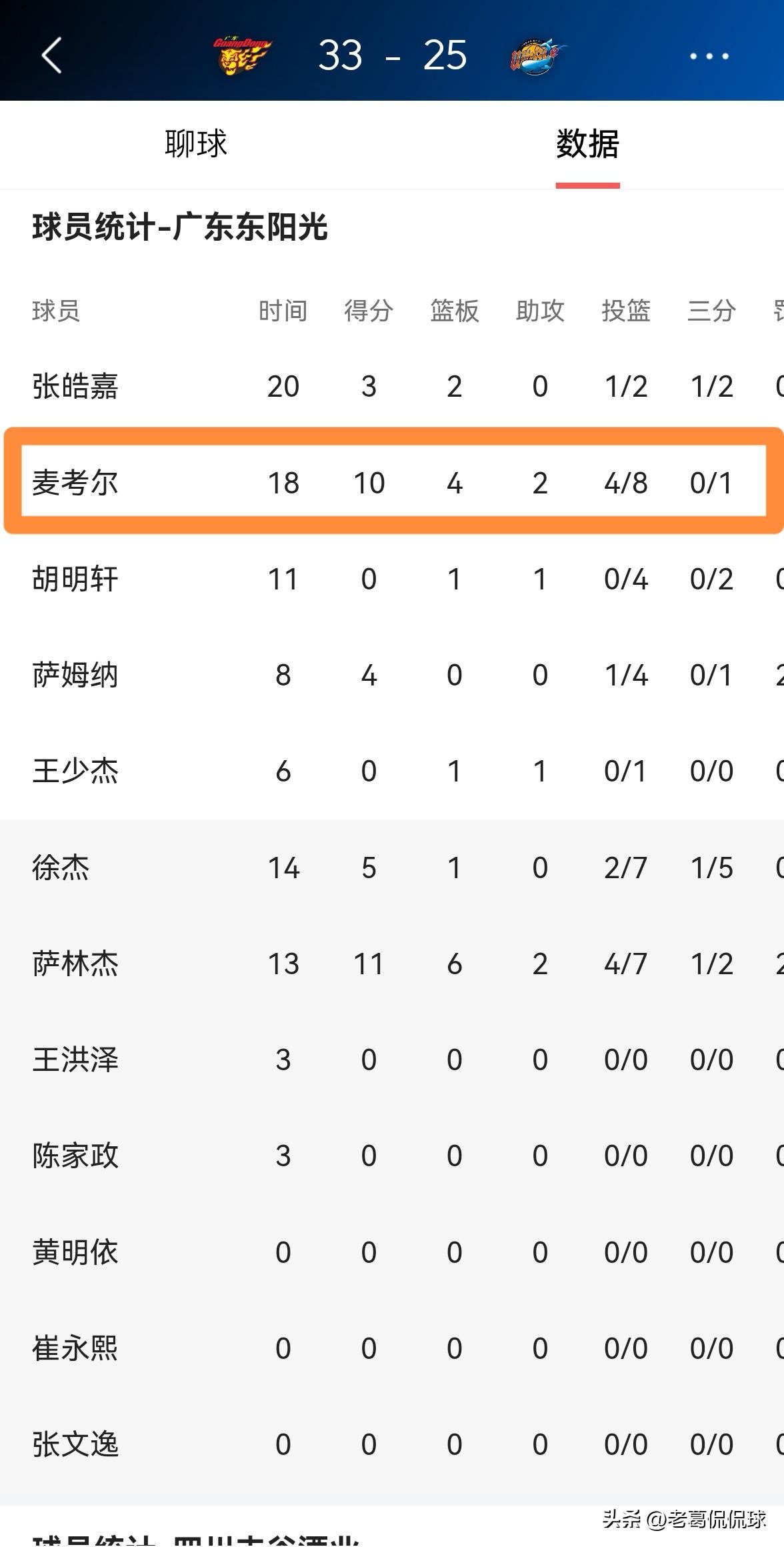 广东东阳光外援麦考尔终于支棱起来了!在今天广东东阳光主场迎战四川丰谷酒业的比赛中,目前双方半场战罢,广东东阳光以33:25领先对手8分。值得一提的是,在前两节比赛中,麦考尔一扫之前的低迷状态终于支棱起来了,他在首发出战的18分钟里,投篮8中4,其中三分球1中0、罚球2中2非常高效的得到10分,还有4篮板2助攻3抢断,他的场上正负值为+9。 坦白说,如果麦考尔能够在接下来的比赛中继续支棱起来,那么我相信麦考尔遭遇的质疑声一定会烟消云散。