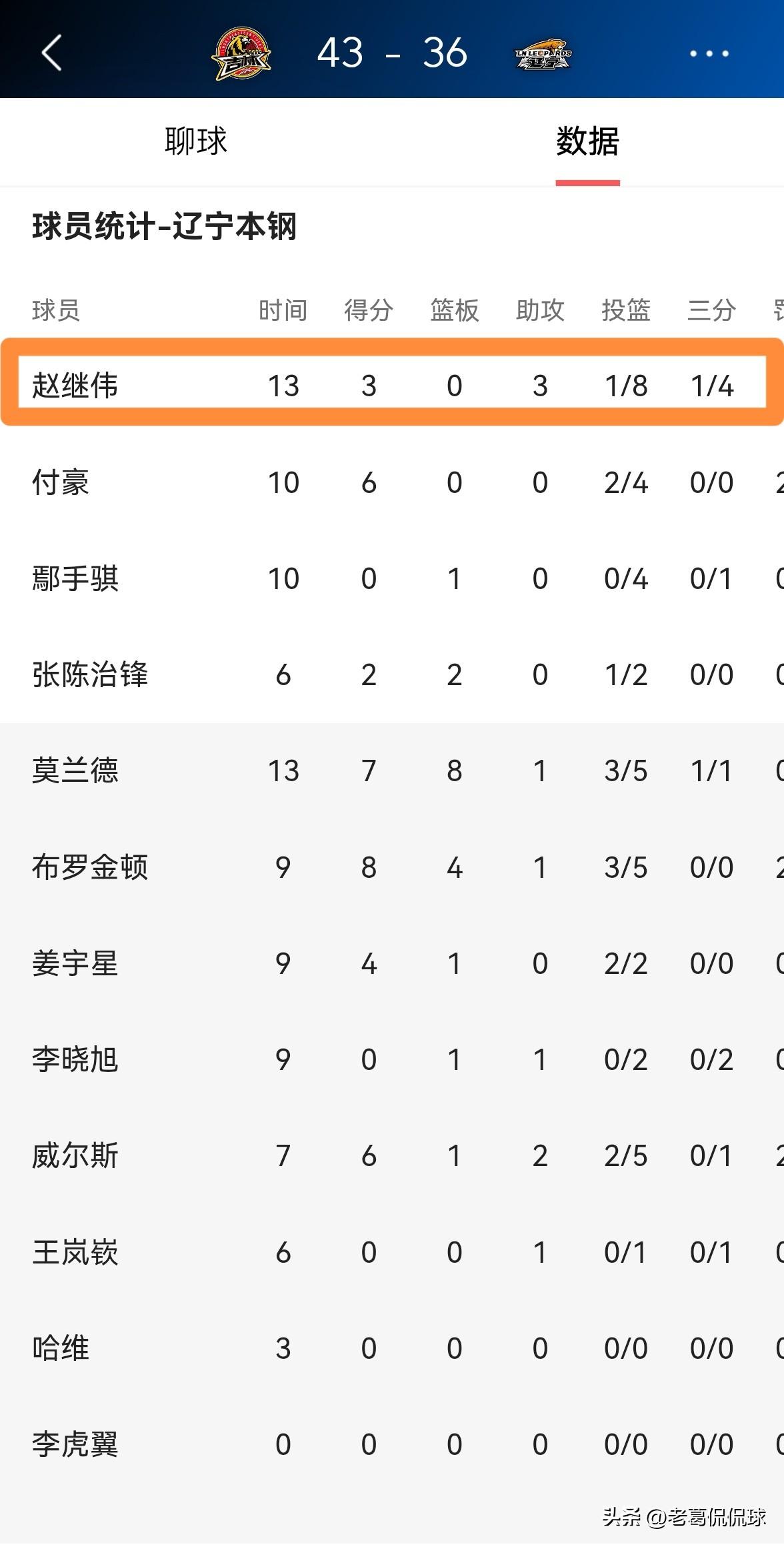 我强烈建议辽宁本钢巨星赵继伟不要浪投了!在今天辽宁本钢客场挑战长白山恩都里的比赛中,目前双方的上半场比赛已经结束,辽宁本钢以36:43落后于对手。让人感到非常失望的是,在前两节比赛中,赵继伟在手感异常冰凉的情况下依然选择浪投,他在首发出战的13分钟里,投篮8中1,其中三分球4中1极其低效的得到3分,他的场上正负值为-8。 老实说,如果赵继伟在接下来的下半场比赛中继续浪投的话,那么辽宁本钢必败无疑。
