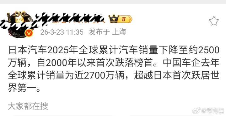 都在宣称中国汽车销量超过日本汽车。有个逻辑疑问❓想不明白。世界汽车消费大国第一的美国市场进不去,日本市场虽然能进,但日本人的消费习惯显然还极少极少接纳中国车,实在想不明白这两千七百万辆车都卖给了谁?具体各国的数据有没有?谁来解释解释? 汽车资讯 汽车 新能源汽车