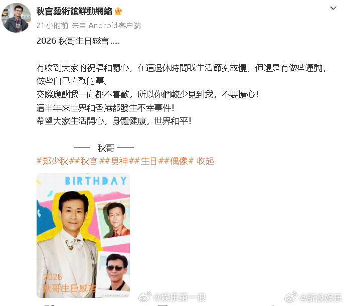郑少秋退休郑少秋近况 郑少秋2026年生日感言透露自己已退休,将生活节奏放慢,做些运动和自己喜欢的事。