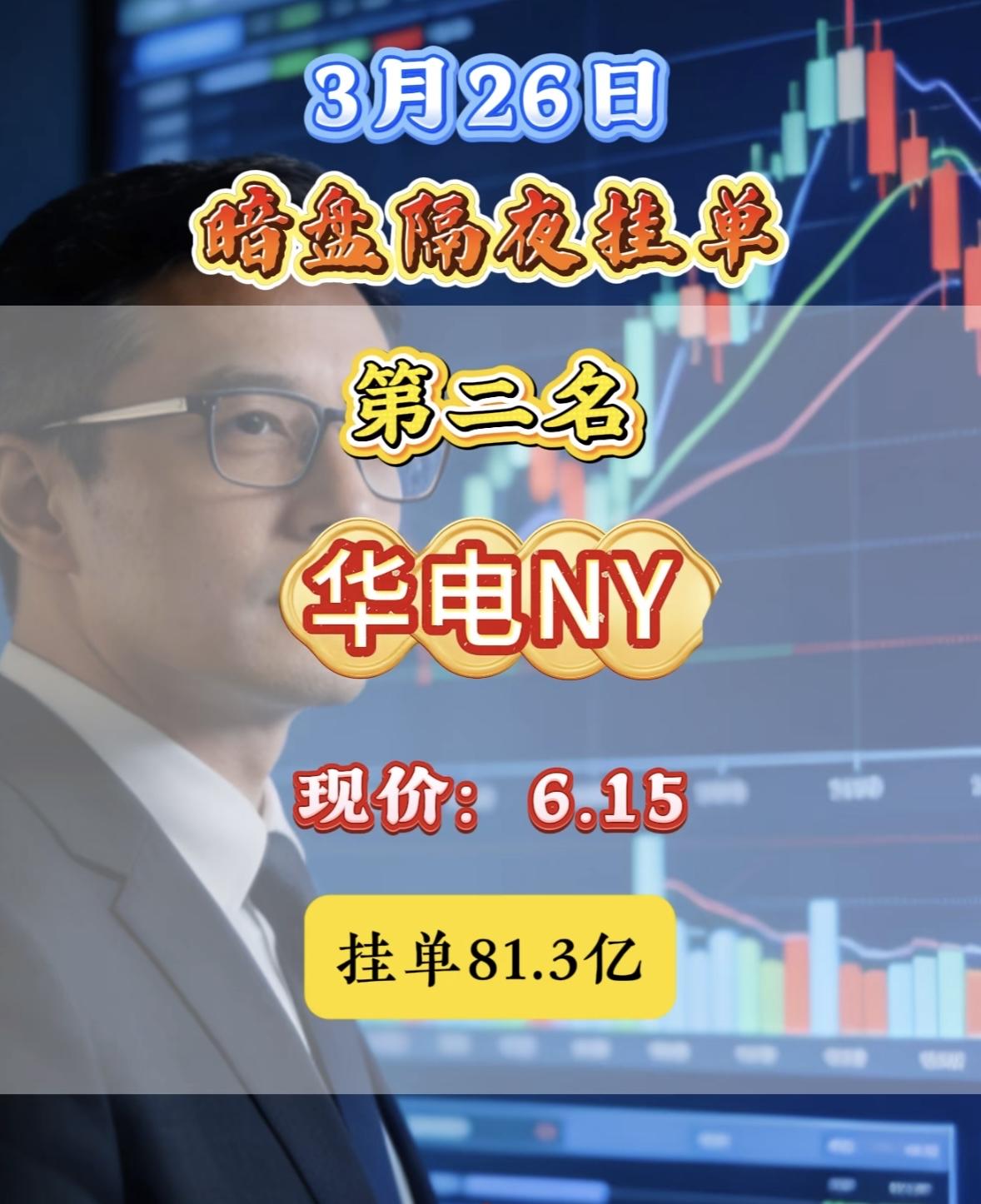 3月26日周四暗盘隔夜挂单排行榜出炉 3月26日暗盘隔夜就挂单28.7亿,粤电力A这是要搞大事情啊!目前现价7.46元,此前在3月25日就以这个价格封住涨停板,涨幅达10.03%,正式进入“主升浪”加速阶段。 不过这股票此前就有交易异常波动情况,2月18 - 19日连续两个交易日收盘价格涨幅偏离值累计超20%。它主营业务是火电发电,售电收入占比近98%,但2025年度净利润预计同比下降21.45% - 40.12%。投资的光伏项目装机小、运行短还没收入。这次挂这么大单子,后续是继续疯涨还是来个大反转,真是让人期待又紧张!